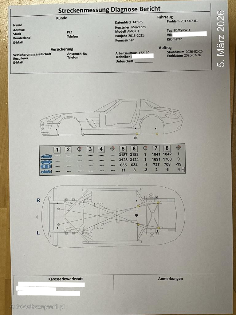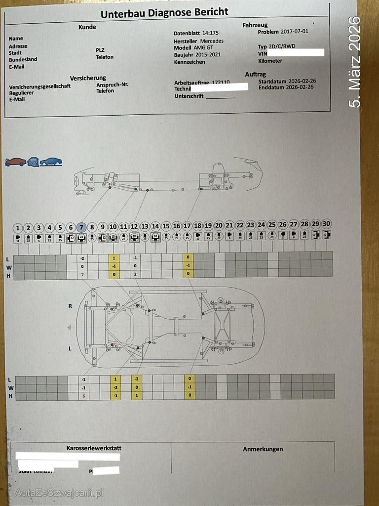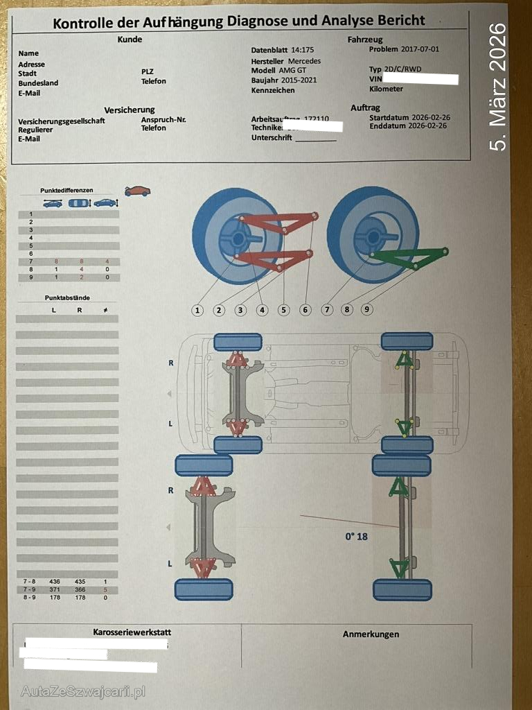 | Schadensbeschreibung | Beschreibung der Schäden: Das Fahrzeug ist mit der rechten Seite mit einem Trottoir kollidiert. Dabei wurden Reifen Felgen Radaufhängung Lenkung der rechten Seite beschädigt. Gemäss beiliegenden Dokumenten kann erkannt werden, dass die Aufhängungpunkte der Radaufhängung leicht verschoben sind. Im Innenraum wurden die diversen Steuergeräte zur Unfallanalyse ausgebaut, diese sollten jedoch bis auf das Airbag Steuergerät vorhanden sein. |
