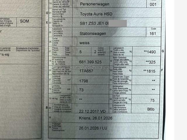 | Condition_and_Equipment | Demontage Persönliche Gegenstände oder Ladegut im Fahrzeug werden entfernt. Bereifung Fahrzeug wird mit Winterräder abgegeben. Schlüssel Nur ein Schlüssel vorhanden. Weitere wichtige Hinweise Taxi-Zubehör wird Entfernt --- Rechts Rechte Seite beschädigt. Front Front rechts eingedrückt. Achse Aufhängungsteile vorne rechts beschädigt. Risiko Vorderachse. Risiko Lenkung. Sonstige Schäden Div.Carrosserie Teile sind leicht beschädigt. Div. Roststellen am Fahrzeug. Hagel Hagelschaden leicht. --- Serienaustattung Klimaautomat Airbag Fahrer und Beifahrerseite Elektronische Wegfahrsperre Elektrische Fensterheber vorne + hinten Aussenspiegel elektrisch verstellbar und heizbar Seitenairbag Fahrer und Beifahrerseite Nebelscheinwerfer Zentralverriegelung mit Fernbedienung Lederlenkrad Mittelarmlehne hinten Lenkrad verstellbar Kopfairbag vorne und hinten Audiofernbedienung am Lenkrad Bodenteppiche Stabilitätskontrolle VSC + Traktionskontrolle TRC Leichtmetallräder 16" Rückfahrkamera Knieairbag Fahrer Isofix-Kindersitzbefestigung hinten Dämmerungs-Sensor Rücksitzlehnen getrennt abklappbar 60:40 Reifendruck-Überwachungsanzeige Anschluss USB und AUX Reifen-Reparatur Set LED Tagfahrlicht ABS und EBD Elektr. Bremskraftverteilung inkl. BA Multi-Informationsdisplay Start + Stopp Automatik Fahrer- und Beifahrersitz verstellbar Keine Gewähr auf die Angaben der Serienausstattungen Fernlichtassistent inkl. Spurwechselwarnung Toyota Touch 2/ CD/ MP3/ Bluetooth/ DAB+ Verkehrsschild-Erkennungssystem Pre Collision System Gratis-Service 6 Jahre/ 60'000 km Sonderausstattung Park-Distanz-Sensor vorne + hinten Metallic- oder Mica Lackierung Navigationsmodul Touch 2 Go Plus |