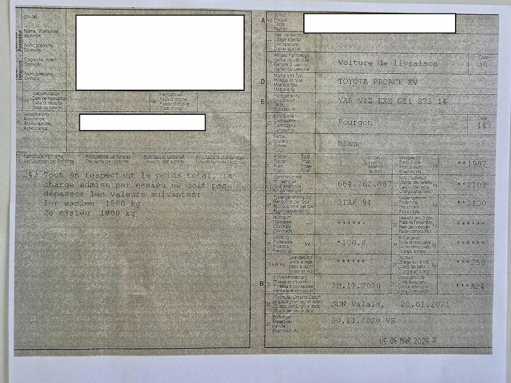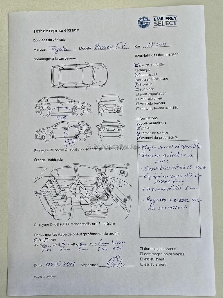 | Information | 2 clés Map + carnet disponible Service entretien à faire Expertise ok 06.03.2026 Equipé en roues d'hiver pneus 6 mm + 4 pneus d'été 5 mm Freins avant 70 % Freins arrière 70 % Rayures et bosses sur la carrosserie Pas de contrôle technique (essai en roues ) effectué |
