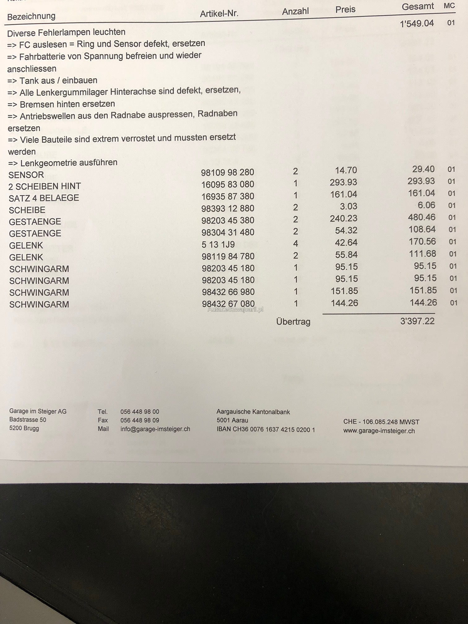| Kommentar | Hinterachse komplett ersetzt, Bremsen hinten komplett neu, Antriebswelle h.l Neu! HV Batterie im 2025 ersetzt auf Garantie! Carrosserie gebrauchsspuren, siehe Fotos! Kein Werkstatt Test gemacht. |