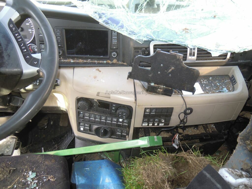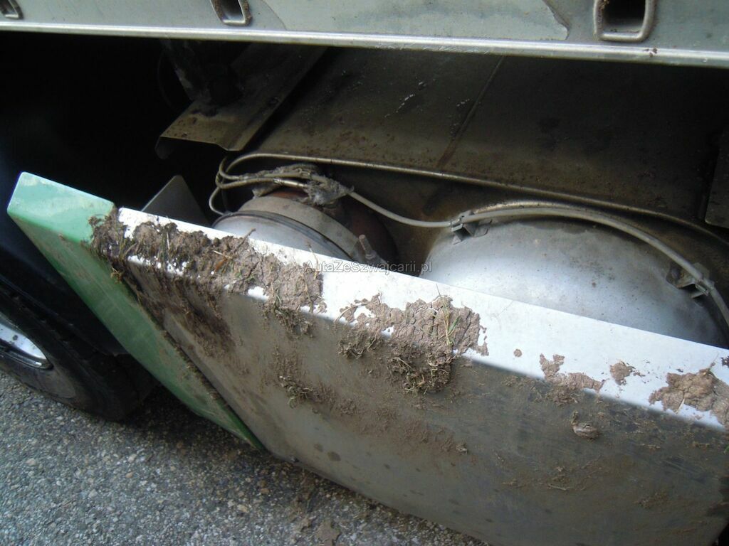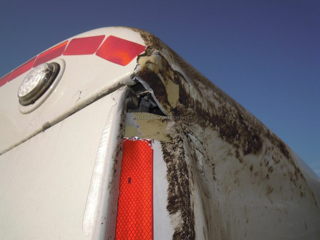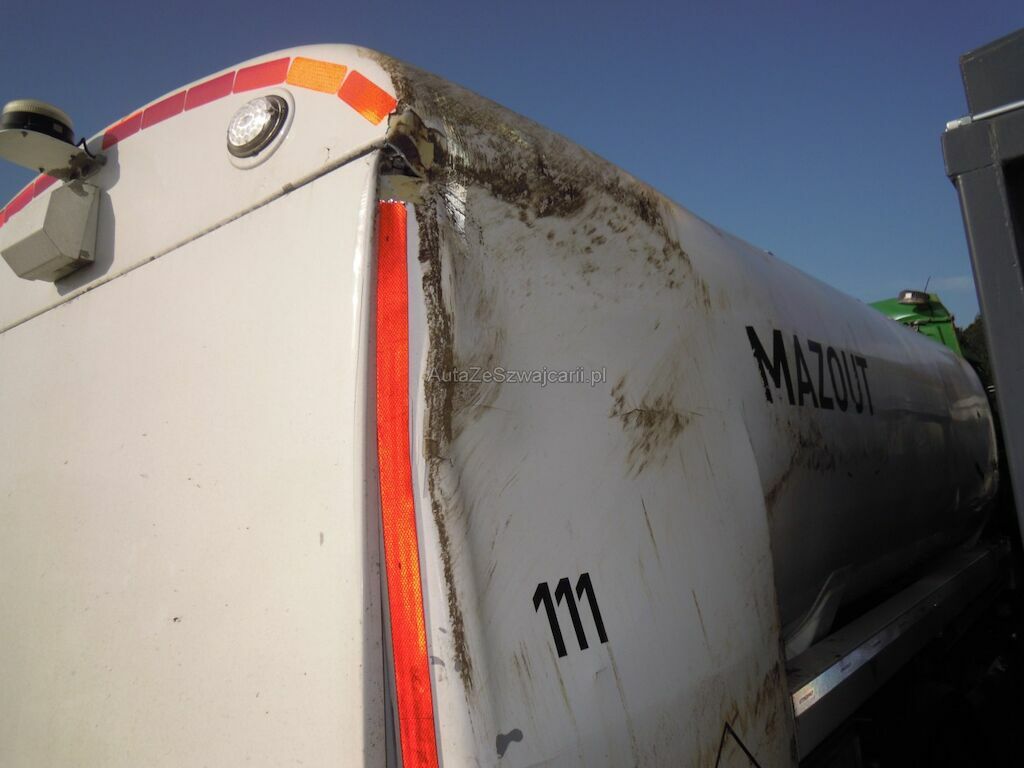 Dommages flanc droit: Cabine fortement déformée, pare-brise, vitres latérales, capot, pare-chocs, phares. rétroviseurs, marche-pied, aile, élargisseur aile, coquilles ailes et éléments intérieurs de cabine cassés, réservoir, tôles latérales, pare-chaleur échappement enfoncés, portillon caisse rangement arrière arraché, citerne déformée et tôle déchirée, porte arrière de fermeture citerne déformée.