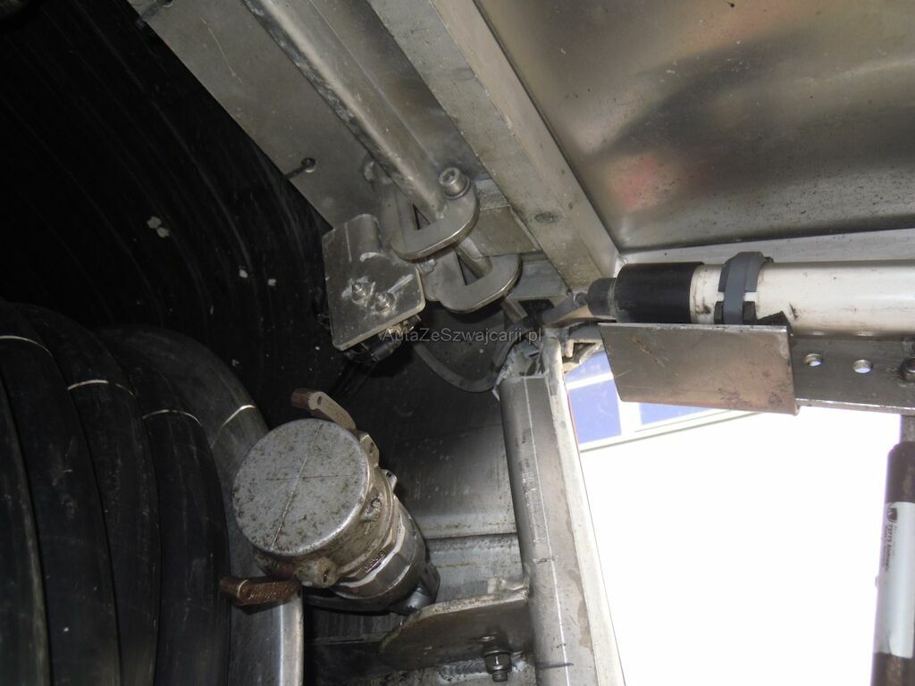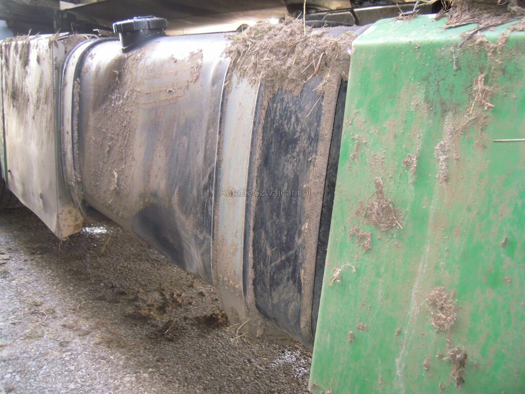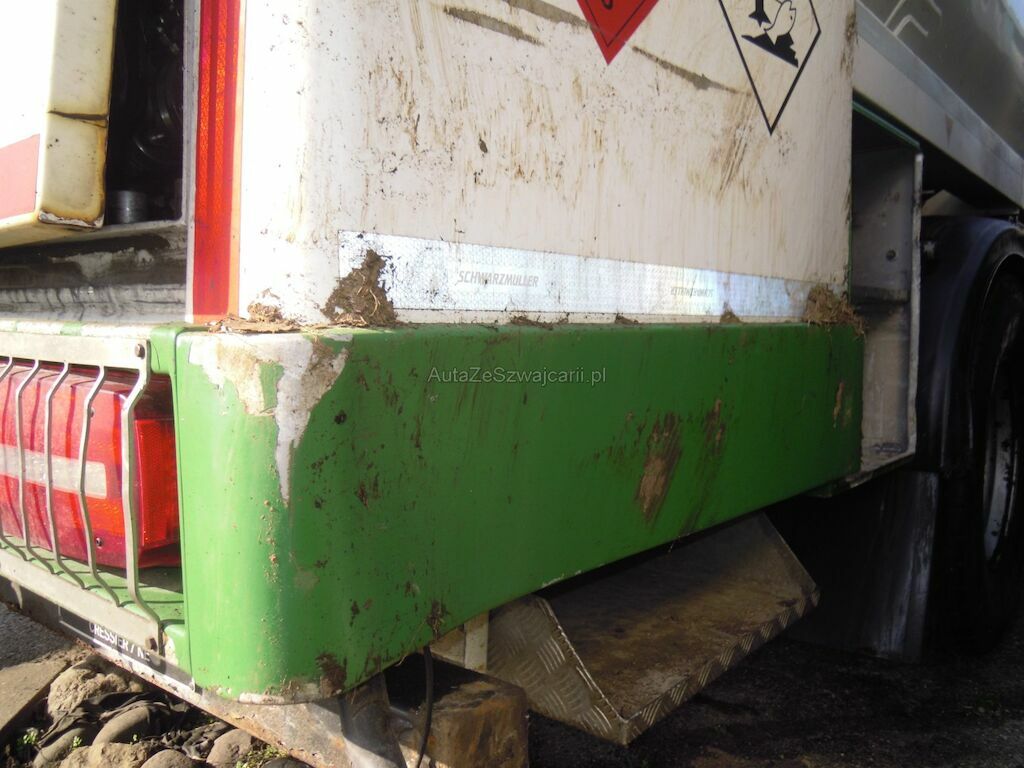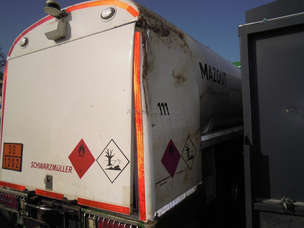 Dommages flanc droit: Cabine fortement déformée, pare-brise, vitres latérales, capot, pare-chocs, phares. rétroviseurs, marche-pied, aile, élargisseur aile, coquilles ailes et éléments intérieurs de cabine cassés, réservoir, tôles latérales, pare-chaleur échappement enfoncés, portillon caisse rangement arrière arraché, citerne déformée et tôle déchirée, porte arrière de fermeture citerne déformée.
