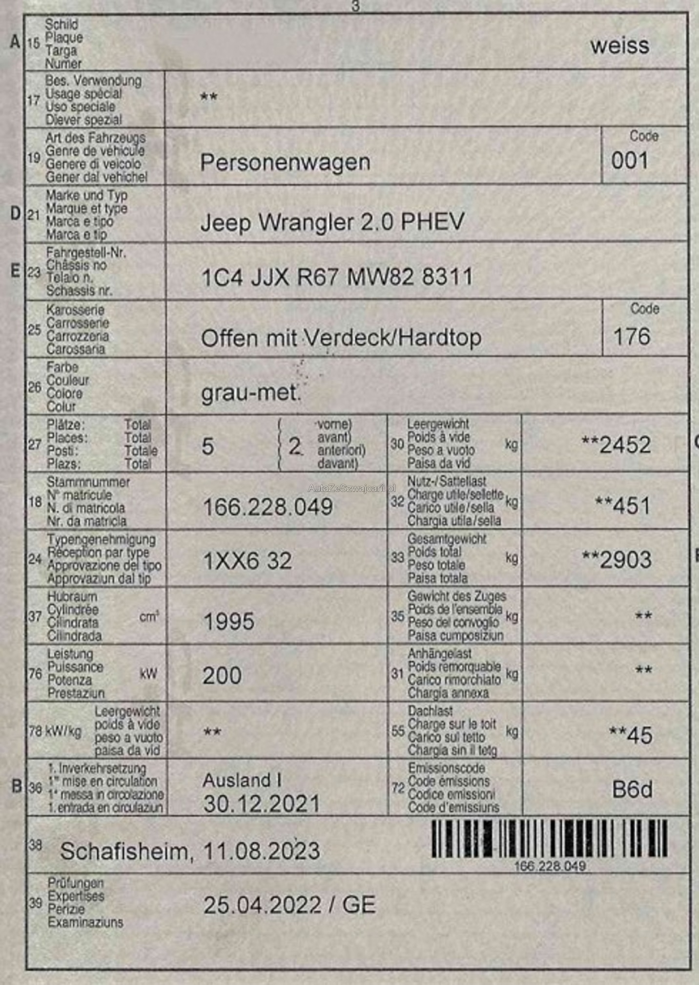 | Kommentar | Das Fahrzeug macht einen sehr guten Eindruck. Der letzte Service wurde im Mai 2025 gemacht und wurde separat quittiert, daher ist dieser nicht im Serviceheft ersichtlich. Der Schaden vorne links am Stossfänger wird voraussichtlich noch vor dem Verkauf instand gestellt. 5 Winter- und 5 Sommerräder (mit Terrainbereifung) vorhanden → siehe Fotos. Es wurde kein Eintauschtest in unserer Werkstatt gemacht, lediglich die Rückrufaktion 68C (Software-Update für das Batteriesteuergerät BMS). Alters-, nutzungs- und laufzeitbedingte Mängel am Fahrzeug sind nicht ausgeschlossen und nicht verhandelbar. Für festgestellte und nicht festgestellte Mängel wird keine Haftung übernommen. Eine Minderung des Kaufpreises oder eine Rückgabe (Wandelung) ausgeschlossen. Das Fahrzeug muss spätestens 5 Tage nach dem Kauf abgeholt werden (gemäss angegebenem Verfügbarkeitsdatum oder Absprache), ansonsten wird eine Standgebühr von CHF 50.- pro Tag verrechnet. |