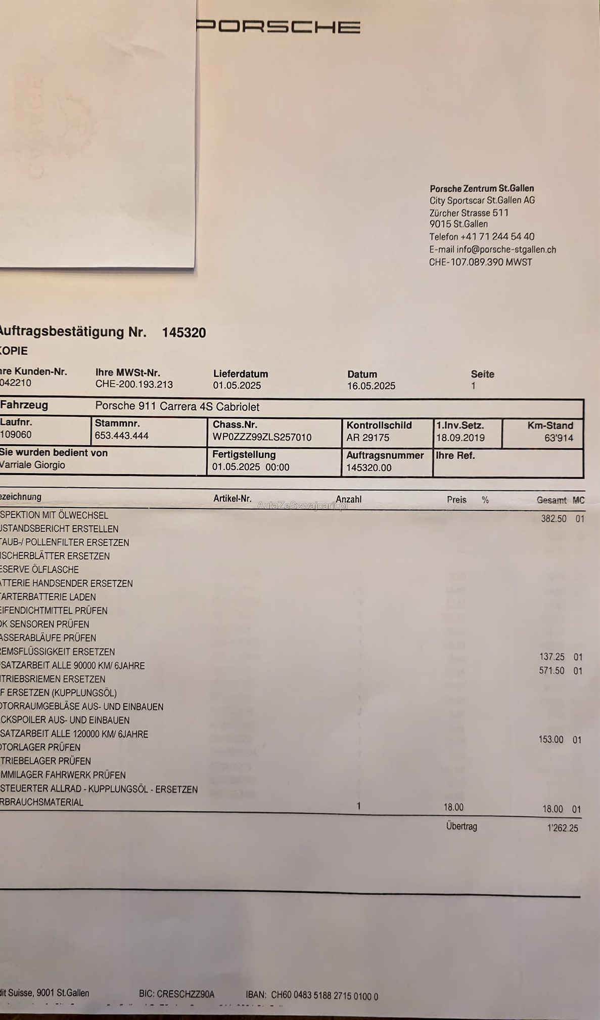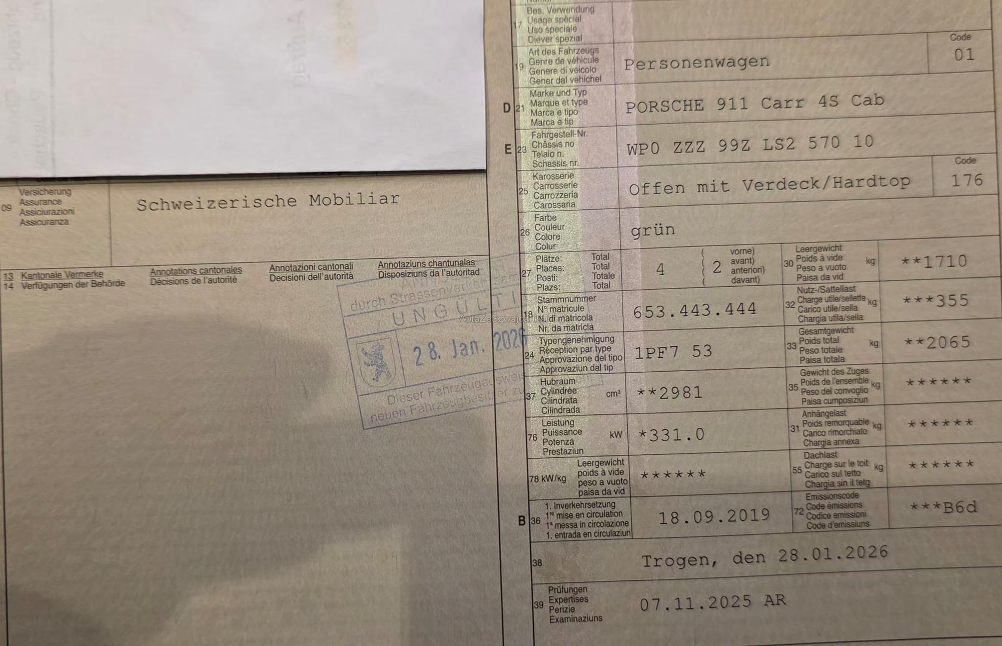 | Kommentar | Ein wunderschön gepflegtes Fahrzeug, wie auf den Bildern ersichtlich, in technisch einwandfreiem Zustand. Besichtigungen sind nach vorheriger Terminvereinbarung jederzeit möglich. Sommerräder sollten demnächst erneuert werden. Die Karosserie weist keine grösseren Abnützungen auf. Lediglich kleinere Steinschläge an der Motorhaube und an der Seite sind vorhanden (siehe Bilder). Der grosse Service wurde im Mai 2025 durchgeführt (Rechnung vorhanden). Porsche Approved Garantie bis Februar 2027 – diese kann selbstverständlich in den folgenden Jahren verlängert werden. Sonderausstattung Adaptive Sportsitze inkl. Komfort-Memory-Paket Interieur in Leder Sport Chrono Paket Garagentoröffner HomeLink Komfortzugang Aussenspiegel elektrisch anklappbar Windschutzscheibe mit Graukeil Leichtmetallräder 20"/21" Carrera Classic Winter-Leichtmetallräder in Matt-Schwarz (siehe Bilder) Servolenkung Plus Hinterachslenkung Spurwechselassistent Spurhalteassistent inkl. Verkehrszeichenerkennung Abstandsregeltempomat Park-Distanz-Sensoren vorne und hinten Rückfahrkamera und 360° Surround View Matrix LED-Scheinwerfer Beheizbares GT-Sportlenkrad Vordersitze belüftet Sitzheizung vorne Porsche Wappen auf den Kopfstützen DAB+ Digital Audio Bose Surround Sound System Der Verkauf wird direkt mit dem Kunden abgewickelt. Das Fahrzeug wird mit Porsche Approved Garantie verkauft. Wandelung und Minderung werden jedoch vertraglich ausgeschlossen. |