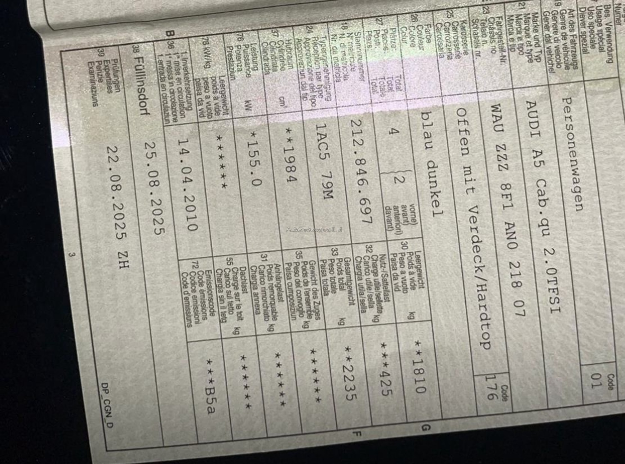 | Kommentar | Eintauschfahrzeug ohne Kontrolle. Gemäss Vorbesitzer erhöhter Ölverbauch - bekanntes Problem bei diesen Motoren. Keine Kontrolle durch uns durchgeführt. Wandelung/Minderung ausgeschlossen. Abholung innert fünf Arbeitstagen. |