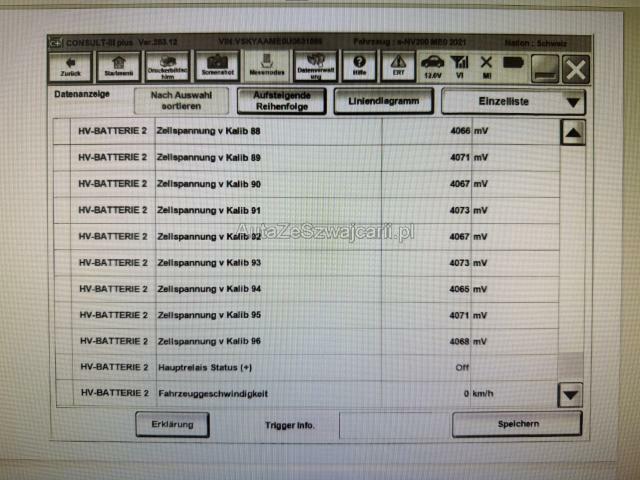 | Condition_and_Equipment | Zustand Fahrzeug muss transportiert werden (Höhe und Breite beachten). Fahrzeug ist rollbar. Bereifung Fahrzeug wird mit Winterräder abgegeben. Schlüssel Nur ein Schlüssel vorhanden. Hersteller- und Gewährleistungsbedingungen Die Fahrzeuggarantie oder Gewährleistung wird möglicherweise nicht vom Hersteller fortgeführt Standzeit Das Fahrzeug wurde lange nicht gefahren Hochvoltfahrzeug Zum Zeitpunkt der Prüfung ging von der Batterie keine Brandgefahr aus. Die geforderten Sicherheitsbestimmungen sind zwingend vom Käufer einzuhalten. Kein Ladekabel vorhanden Weitere wichtige Hinweise Ex. Behördenfahrzeug Kein Serviceheft oder Unterlagen vorhanden Die Batterie wurde von der Garage geprüft und für gut befunden --- Rechts Rechte Seite beschädigt. Anstoss rechts im Bereich der A-Säule. Front Front eingedrückt. Radhaus vorne rechts eingedrückt / gestaucht. Achse Vorderachse ist beschädigt. Risiko Lenkung. Sonstige Schäden Div.Carrosserie Teile sind leicht beschädigt. --- Serienaustattung Klimaautomat Airbag Fahrerseite Elektrische Fensterheber Aussenspiegel elektrisch verstellbar Schiebetüre rechts Nebelscheinwerfer Airbag Beifahrerseite ESP Elektronisches Stabilitätsprogramm Seiten-Airbag Fahrer und Beifahrerseite Rückfahrkamera Gummi-Bodenabdeckung im Laderaum Multifunktionslenkrad ABS + EBV + Bremsassistent Bordcomputer Tempomat und Geschwindigkeitsbegrenzer Trennwand verblecht Hecktüren 180° verblecht Stahlfelgen 15" Reifendruck-Kontrollsystem RDK Keine Gewähr auf die Angaben der Serienausstattungen Radio/ CD/ MP3/ Bluetooth/ USB Pack Winter Keyless Open/ Schliess- und Startsystem Ladeanschluss vorne Antriebsbatterie gekauft Batteriekühler Anschlussgarantie 5 Jahre oder 100'000 km |
