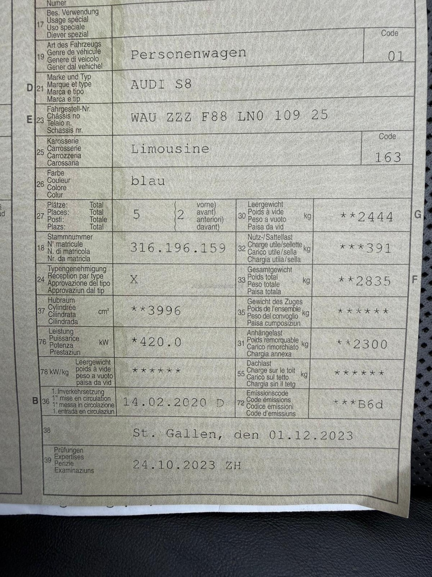 | Kommentar | Motor /Getriebe I.O Felgen SO & müssen instand gestellt werden. Gebrauchtes Fahrzeug Kann diverse Kratzer und Beulen aufweisen. Fahrzeugbereifung und Ausstattung gemäß Fotos. Keine mechanische Prüfung, Fahrzeugkauf auf eigenes Risiko ab Platz ohne Nachwährschaft. Die Gewährleistung für Sachmängel wird wegbedungen. Keine Barzahlung möglich Sie erhalten von uns nach zusage eine Rechnung muss inert 3 Tagen Bezahlt und abgeholt werden |