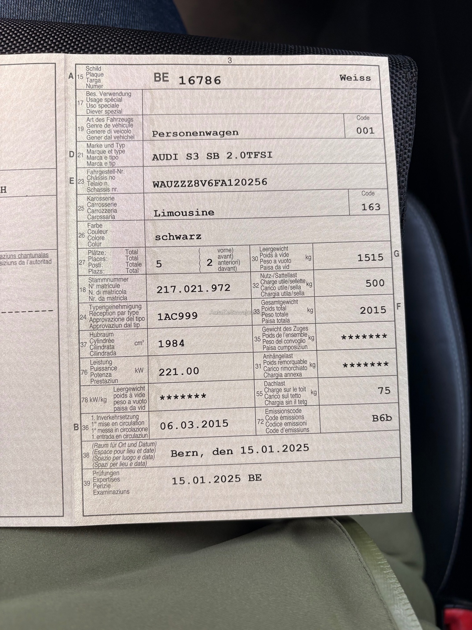 | Kommentar | Es wurde kein Werkstatttest gemacht. Fahrzeug war bis heute im täglichen Einsatz. Es riecht nicht nach rauch, der Fahrersitz hat aber ein kleines Brandloch. Fahrzeug ab Platz ohne Garantie, Wandelung und Minderung ausgeschlossen. |