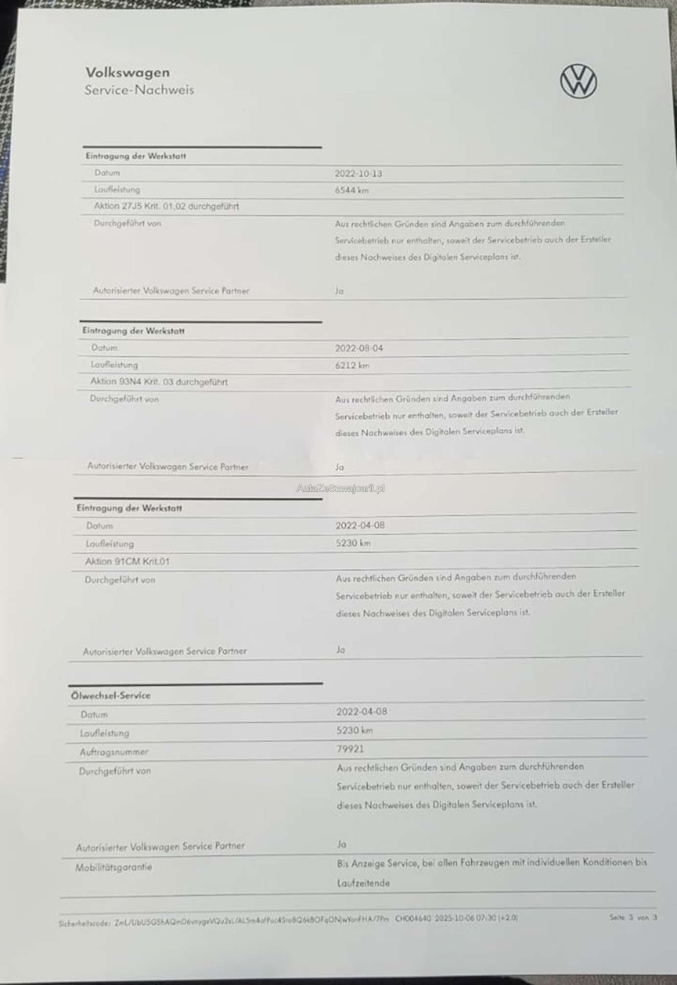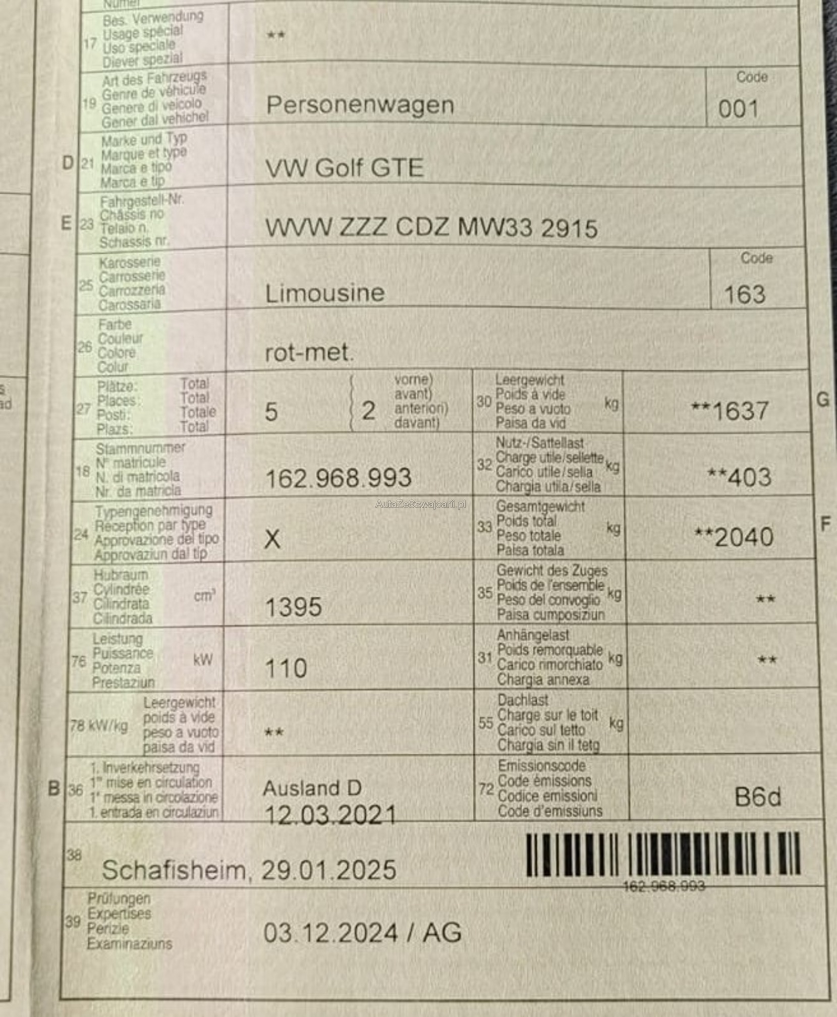 | VIN | WVWXXX |
