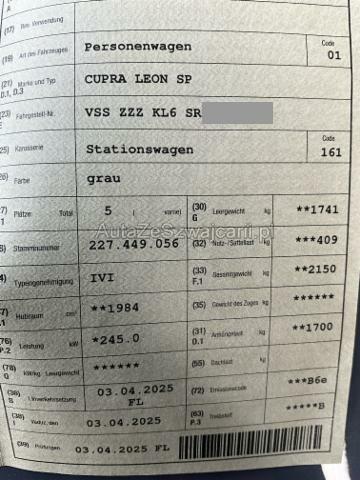 | Condition_and_Equipment | Zustand Fahrzeug muss transportiert werden (Höhe und Breite beachten). Fahrzeug ist rollbar. Bereifung Fahrzeug wird mit Winterräder abgegeben. --- Links Linke Seite beschädigt. Rechts Rechte Seite beschädigt. Anstoss rechts im Bereich der B-Säule. Heck Seitenwand hinten rechts eingedrückt/aufgestaucht. Seitenwand hinten links eingedrückt/ausgestaucht. Glas Glasdach beschädigt. Dach Dach eingedrückt. --- Serienaustattung Airbag Fahrer und Beifahrerseite Sitzheizung vorne Fahrersitz elektrisch verstellbar mit Memory Elektrische Fensterheber vorne + hinten Tempomat TCS Elektronische Traktionskontrolle Mittelarmlehne vorne Mittelarmlehne hinten ABS und EBV Elektr. Bremskraftverteilung Sportlenkrad Deaktivierung Beifahrerairbag Fussmatten vorne und hinten Aussenspiegel elektrisch verstellbar/ heizbar und anklappbar Alarmanlage mit Innenraumüberwachung Lenkrad beheizbar Rückfahrkamera Seitenairbags vorne Automatisch abblendbarer Innenspiegel Dachreling schwarz Kopfairbag vorne Regen- und Lichtsensor Lichtassistenzsystem (Coming-Home Funktion) Dachhimmel schwarz Servolenkung geschwindigkeitsabhängig Vordersitze höhenverstellbar Keyless Schliess- und Startsystem Kindersitzverankerung ISOFIX hinten Abgedunkelte Scheiben ab B-Säule Mobiltelefon Freisprechanlage/ Bluetooth Lendenwirbelstütze Fahrer- und Beifahrersitz Rücksitzlehne geteilt 1/3 oder 2/3 / umklappbar Elektr. Lendenwirbelstütze Fahrersitz Schalensitze vorne Automatische Distanzregelung ACC Heckklappe elektrisch Fernlichtassistent ESP/ DSR/ EBA/ RDK Einparkhilfe vorne und hinten Ladeboden variabel Start + Stopp Funktion LED-Scheinwerfer LED Tagfahrlicht Sprachsteuerung Elektrische Parkbremse inkl. Hill Assist Schaltwippen am Lenkrad Spurhalteassistent LDW Details siehe gültige Preisliste des Importeurs Klimaanlage Climatronic 3-Zonen Keine Gewähr auf die Angaben der Serienausstattungen DAB+ Digital Audio Broadcast Adaptive Fahrwerksregelung DCC Verkehrsschild-Erkennungssystem FullLink LED-Nebelscheinwerfer mit Corner Funktion Connect Connectivity Box Drive Profile Müdigkeitserkennung Digital Display Cockpit 2 USB-C Anschlüsse 2 USB-C Anschlüsse hinten LED Innenraumbeleuchtung Multicolor Safety & Services Leichtmetallfelgen 19" Polar Pack Dynamic Design Multifunktionskamera Pack Edge Sonderausstattung Anhängevorrichtung abnehmbar Panorama-Schiebedach Schwellerverkleidung lackiert Speziallackierung Garantieverlängerung für das 3. + 4. + 5. Jahr/ 100'000 km Infotainment Online Leichtmetallfelgen 19" Polar Copper Sennheiser Immersive Soundsystem Pack Cupra Ausstattung Sommerräder MIT Leichtmetall-Felgen. Sonstige Ausstattung und Zubehör cupra winterkomplettrad 19 zoll, ablieferpauschale |