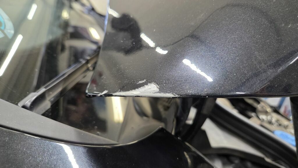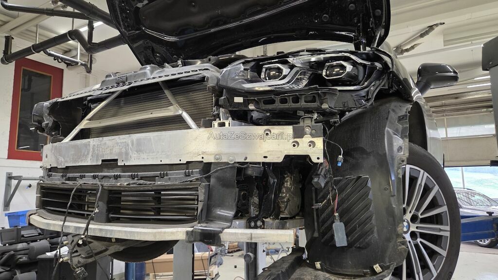 massiver Frontschaden, Haube, Kotflügel, Scheinwerfer Stossstange und div Anbauteile beschädigt, Front nach rechts verschoben, Chassisholmen li geknickt und muss ersetzt werden