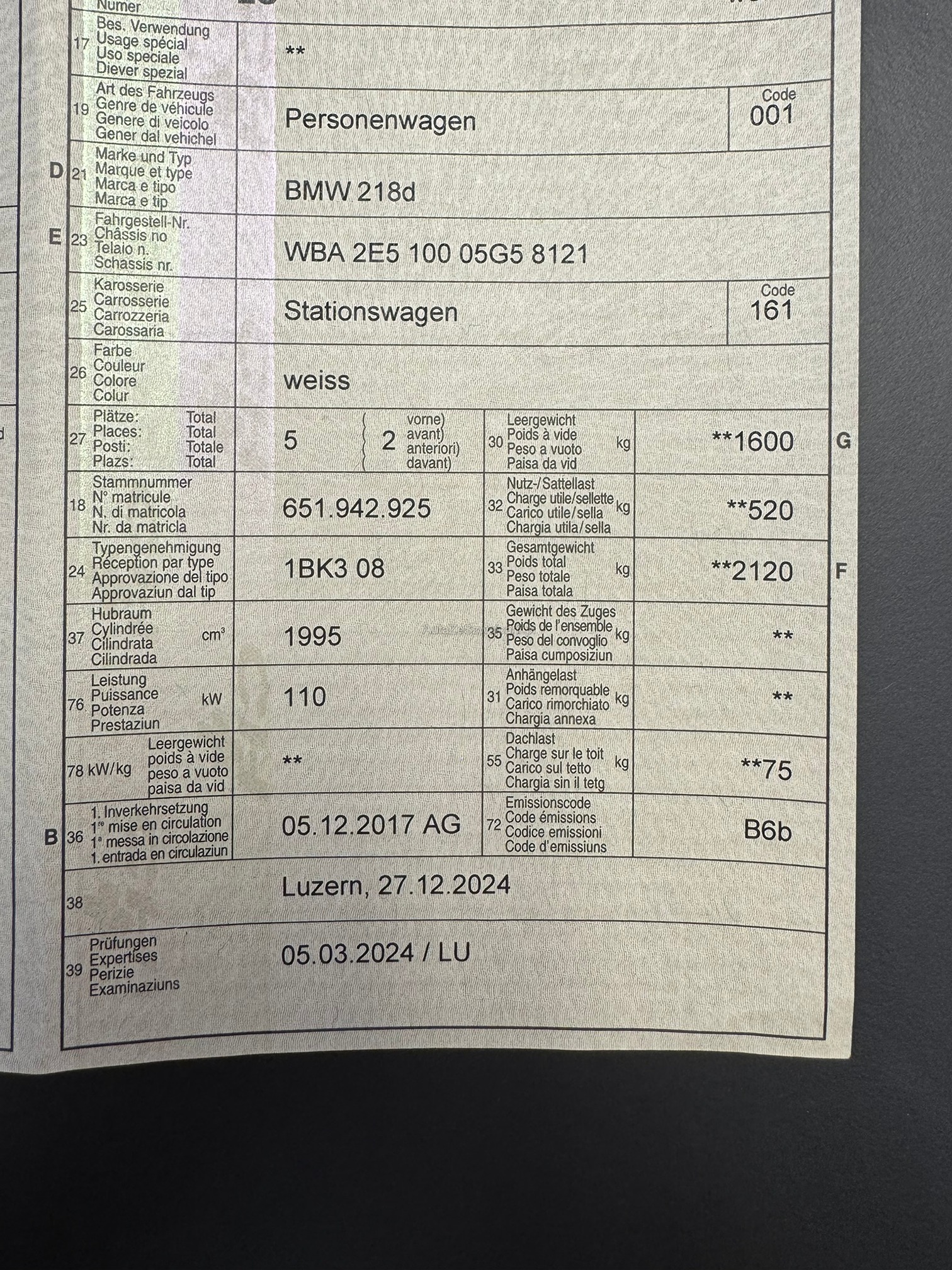| Kommentar | Hagelschaden beinahe nicht sichtbar. Kein Werkstatttest durchgeführt, wird ab Platz ohne Garantie verkauft. Bei einer Fahrzeugbeschreibung kann immer etwas vergessen oder nicht gesehen werden. Das Risiko liegt somit vollumfänglich beim Käufer. Nach Zuschlag, keine Nachverhandlungen möglich. Ab Platz ohne Garantie, Wandelung und Minderung werden wegbedungen. |
