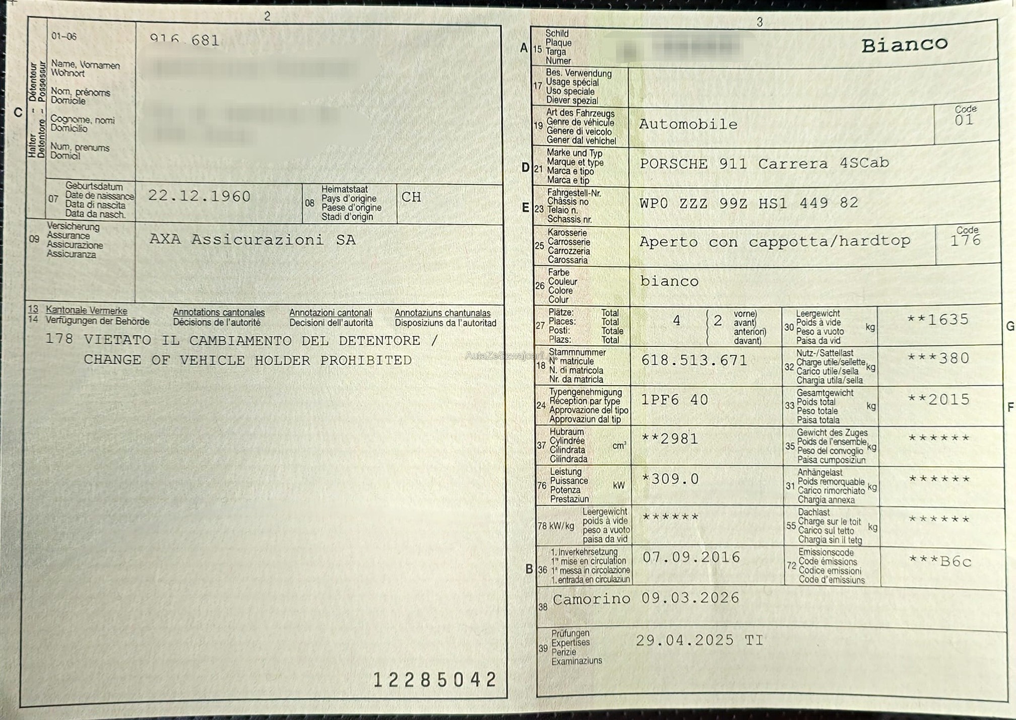 | Kommentar | - Fahrzeug ist in einem Tadellosen Zustand - Kleiner Steinschlag Vo-Re, siehe Foto - Scheibe kleine Steinschläge, Foto - Wir haben jedoch keinen Werkstattest gemacht - Service immer bei Offiziellen Porsche Vertretung, letzter Service war in Lugano - Es gibt keine Nachverhandlung des Preises |