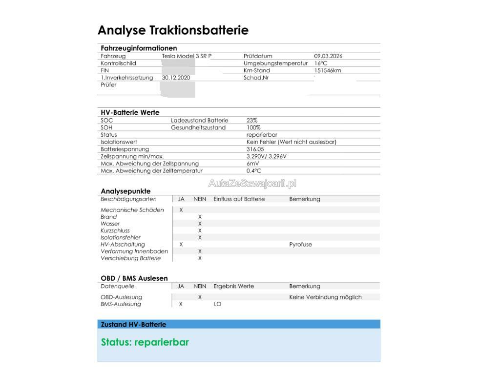 | Zusatzinformationen | Die Hochvoltbatterie wurde geprüft und ist reparierbar. Das Fahrzeug wird mit der HV-Batterie verkauft. Die Pyrofuse sowie der Kühlwasseranschluss an der HV-Batterie muss durch einen Fachbetrieb gewechselt werden. Die (vom Fahrzeugexperten) ermittelten Reparaturkosten beziehen sich auf das versicherte Ereignis. Allfällige zusätzliche, nicht versicherte Schäden/Vorschäden, sind in den Reparaturkosten nicht enthalten. Die deklarierten Ausstattungsmerkmale können von der effektiven Ausstattung abweichen.AchtungBei einem Hochvoltsystem - Spannungsfreiheit prüfen. Sicherheitshinweise und Betriebsanleitungen des Herstellers konsultieren und befolgen. |