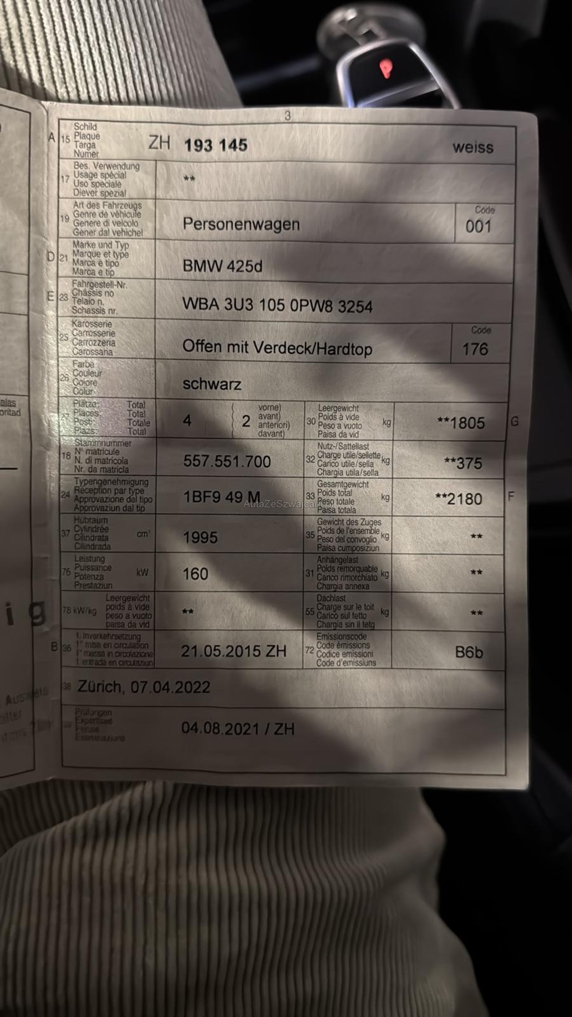 | Kommentar | Wurde seit der letzen MFK 400km bewegt, da der Kunde keine Zeit hatte sich darum zu kümmern. MFK-Bericht ist auf den Fotos hinterlegt. Felgen wurden frisch lackiert Das angebotene Fahrzeug wird ab Platz ohne Garantie und ohne jegliche Nachgewährschaft verkauft. Es handelt sich dabei um ein Eintausch Fahrzeug das div. Gebrauchsspuren und Mängel aufweist. Es wurde keine technischen Prüfung durchgeführt. Jede Gewährleistung, soweit nach Gesetz möglich, wird wegbedungen, insbesondere sind Wandelung und Minderung ausgeschlossen. |