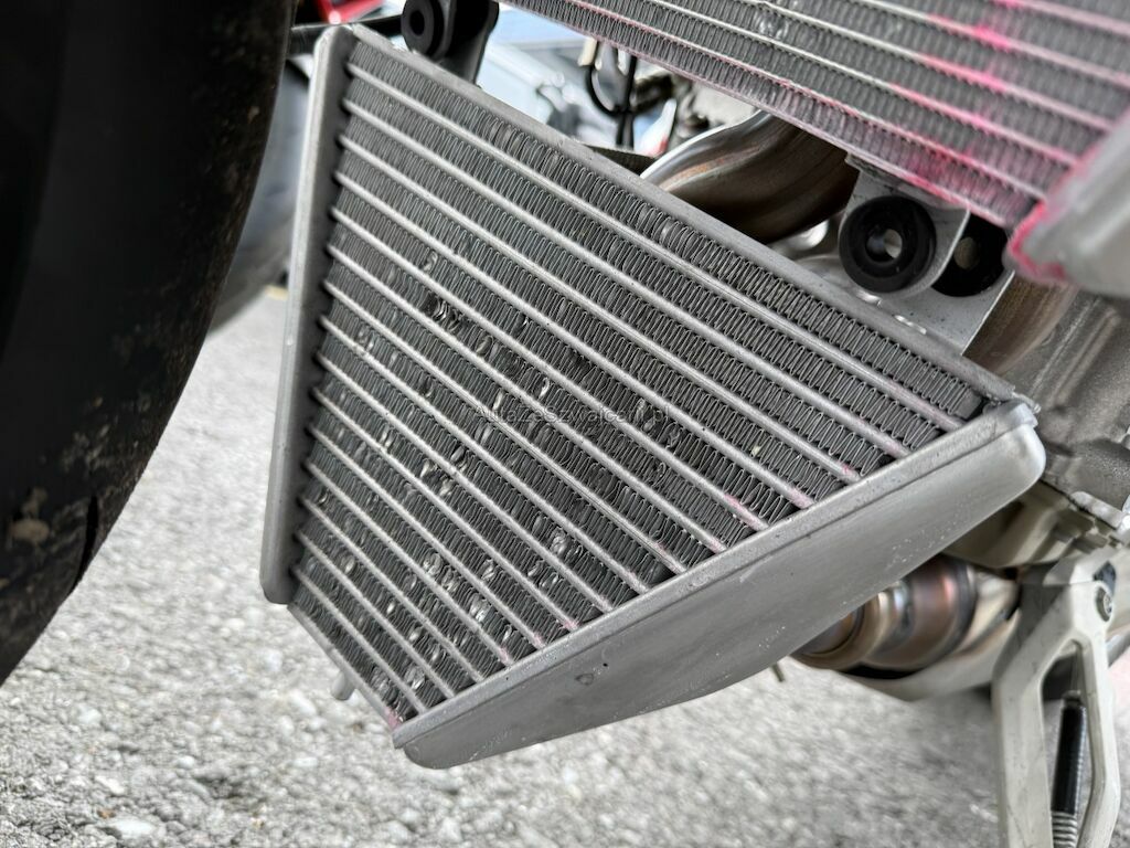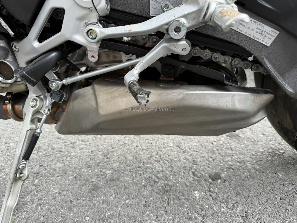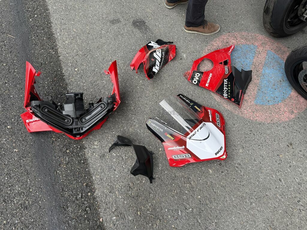 Beschädigung der Verkleidungen auf beiden Seiten sowie an Front und Heck. Deformation an der Vorderachse inklusive beider Gabeln, Gabelbrücke, Lenker, beiden Felgen, der Schwinge und dem Tank. Weiter Beschädigung an der Auspuffanlage, an den Kühlerelementen im Frontbereich, an der Feder sowie Bruch am Frontscheinwerfer.