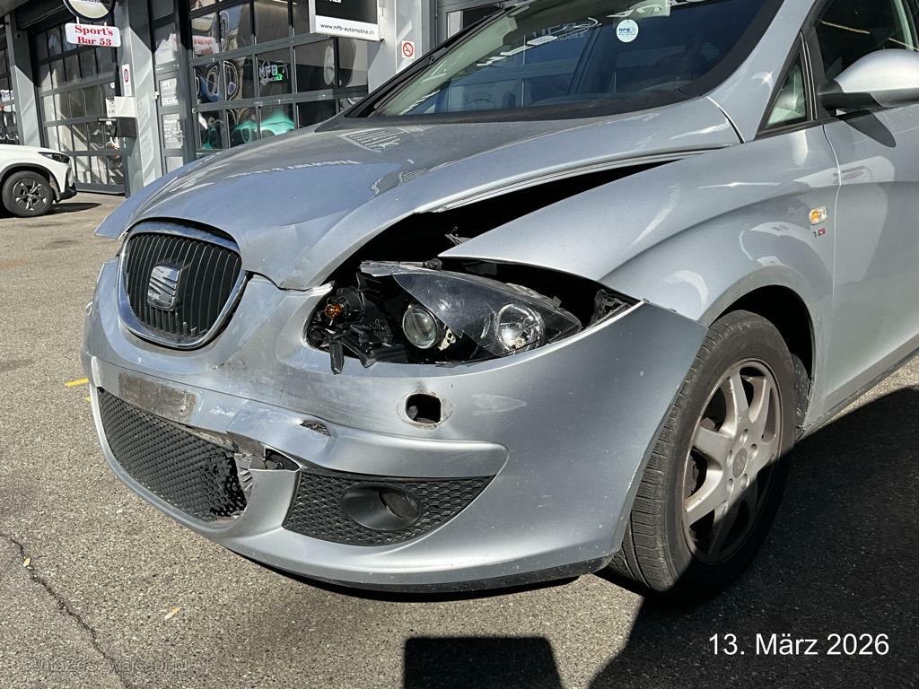 | Schadensbeschreibung | Beschreibung der Schäden: Ecke vorne links eingedrückt Stossfänger, Scheinwerfer, Kotflügel Motorhaube, Frontblech defekt, Kühler ohne Wasser Vorbestandene Schäden: Vorne rechts: Stossfänger und Seitenwand hinten rechts und links eingedrückt beschädigt: Stossstange vorne, rechts unten angekratzt |