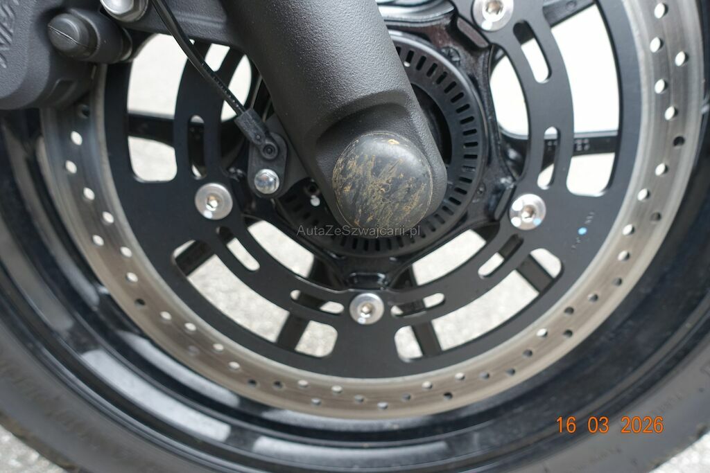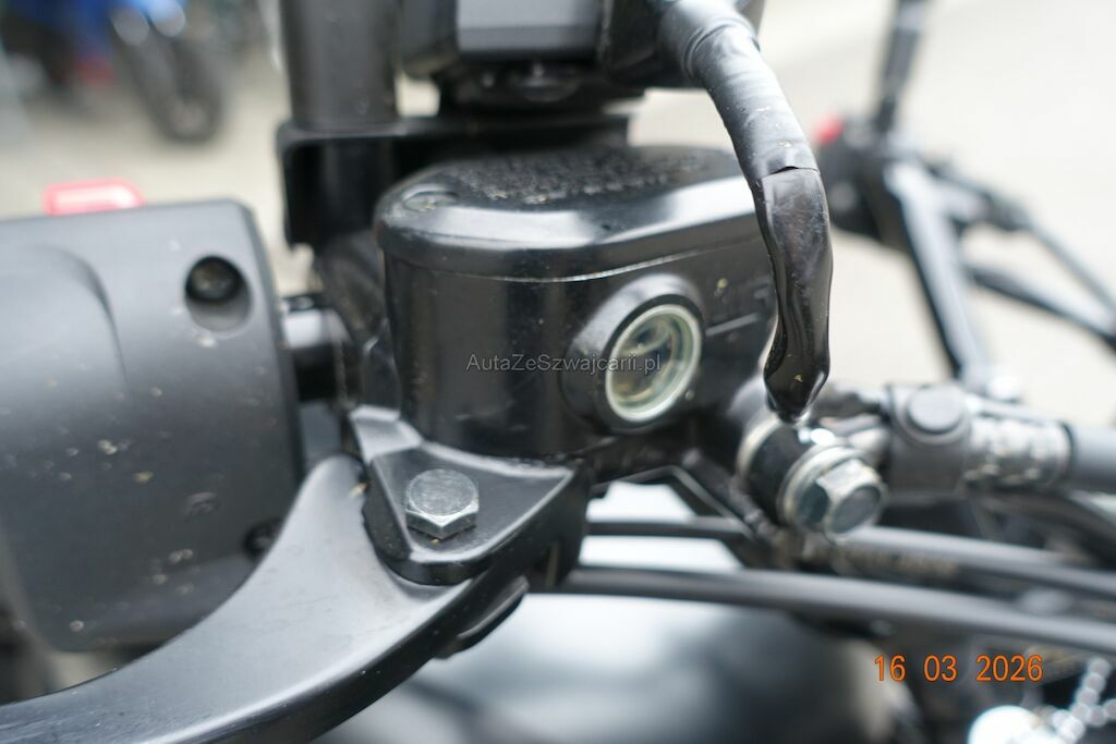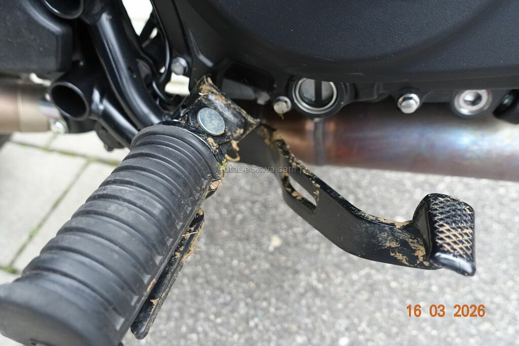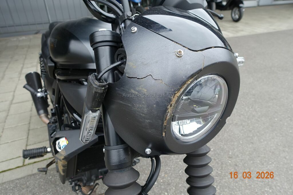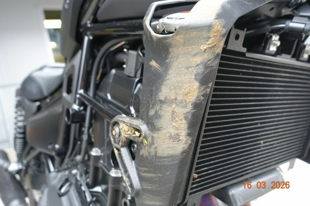 Die Felge vorne ist zerkratzt. Das Scheinwerfergehäuse sowie diverse Verkleidungen sind gebrochen. Der Lenker ist verbogen, dieser ist durch den Sturz an den Tank angestanden und hat zwei Dellen sowie Lackbeschädigungen verursacht. Der Auspuff ist zerkratzt