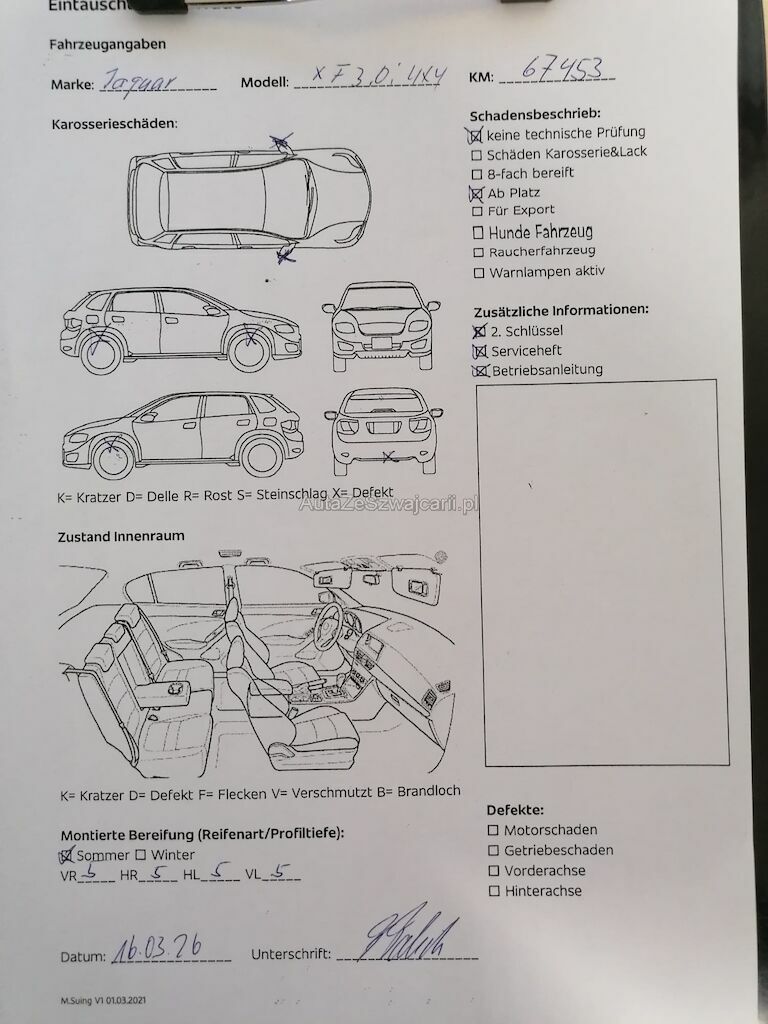 | Information | Keine technische Prüfung (Werkstatttest) vorgenommen Diverse Schäden an Karosserie/Lack. Fahrzeug ab Platz, ohne Garantie und Aufbereitung. DPF/FAP Filter nicht kontrolliert Stossstange hinten hat einen Riss |