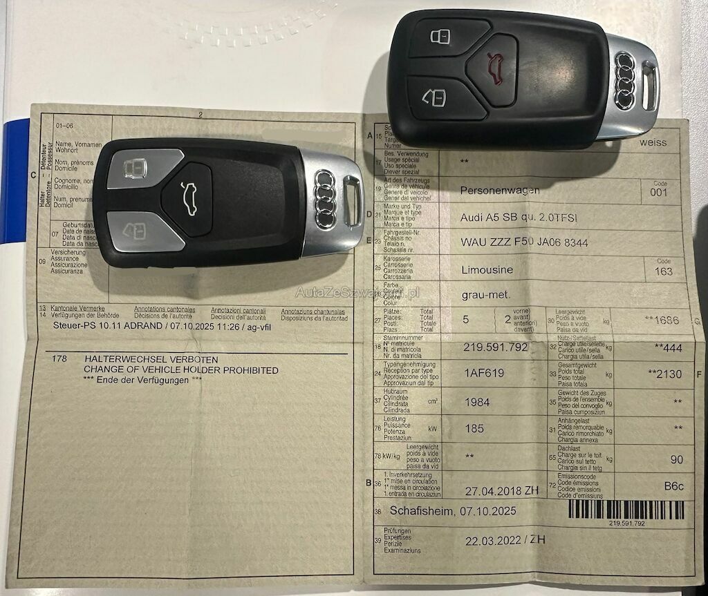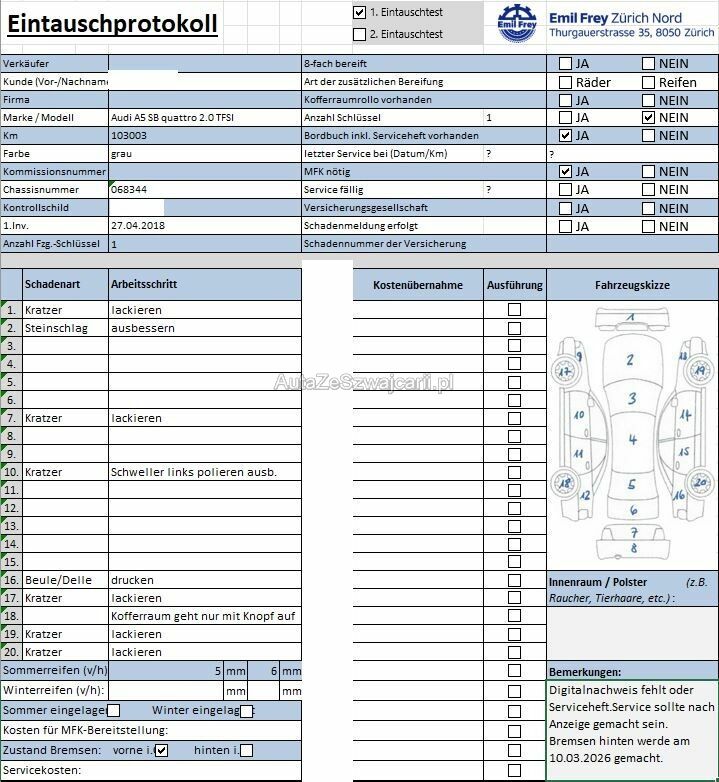 | Information | Keine Gewähr auf die Angaben der Sonder- und Serienausstattung / keine mechanische Prüfung. Fahrzeug wurde unzerlegt expertisiert / keine Haftung für allfällige, nach Demontage bekanntwerdenden Mängel. Fahrzeugbereifung und Ausstattung gemäss Fotos / Fahrzeugkauf auf eigenes Risiko ab Platz ohne Nachwährschaft. - Diverse Dellen und Kratzer am gesamten Fahrzeug - Steinschläge Frontscheibe - Schweller links polieren ausb. - Kofferraum geht nur mit Knopf auf - Letzter Service am 12.02.2025 bei 93'130 Km |
