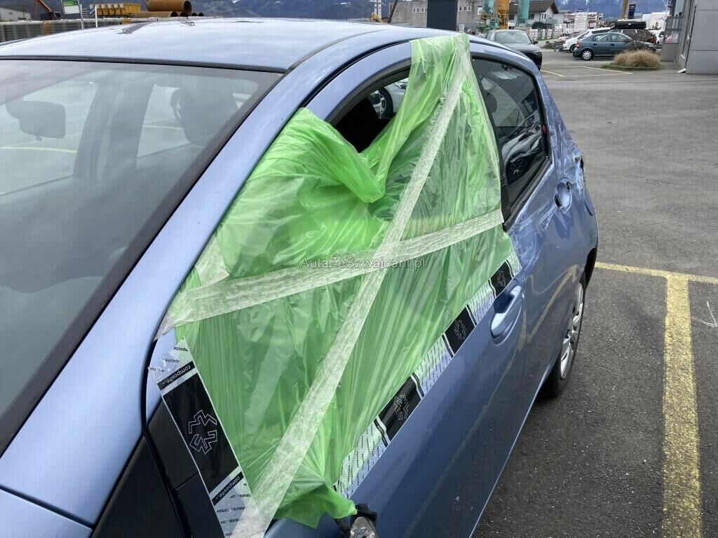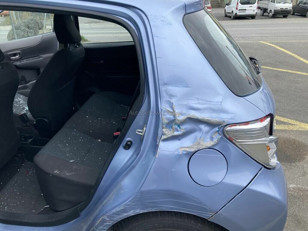 Toyota endommagée sur tout le flanc gauche, 2 portes, vitrage et rétroviseur porte avant gauche, porte et aile arrière gauche fortement endommagées