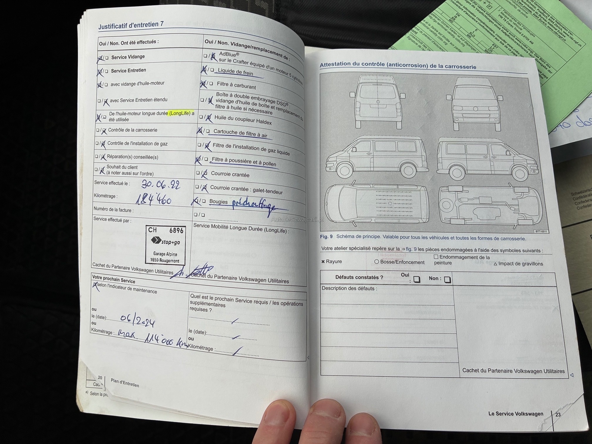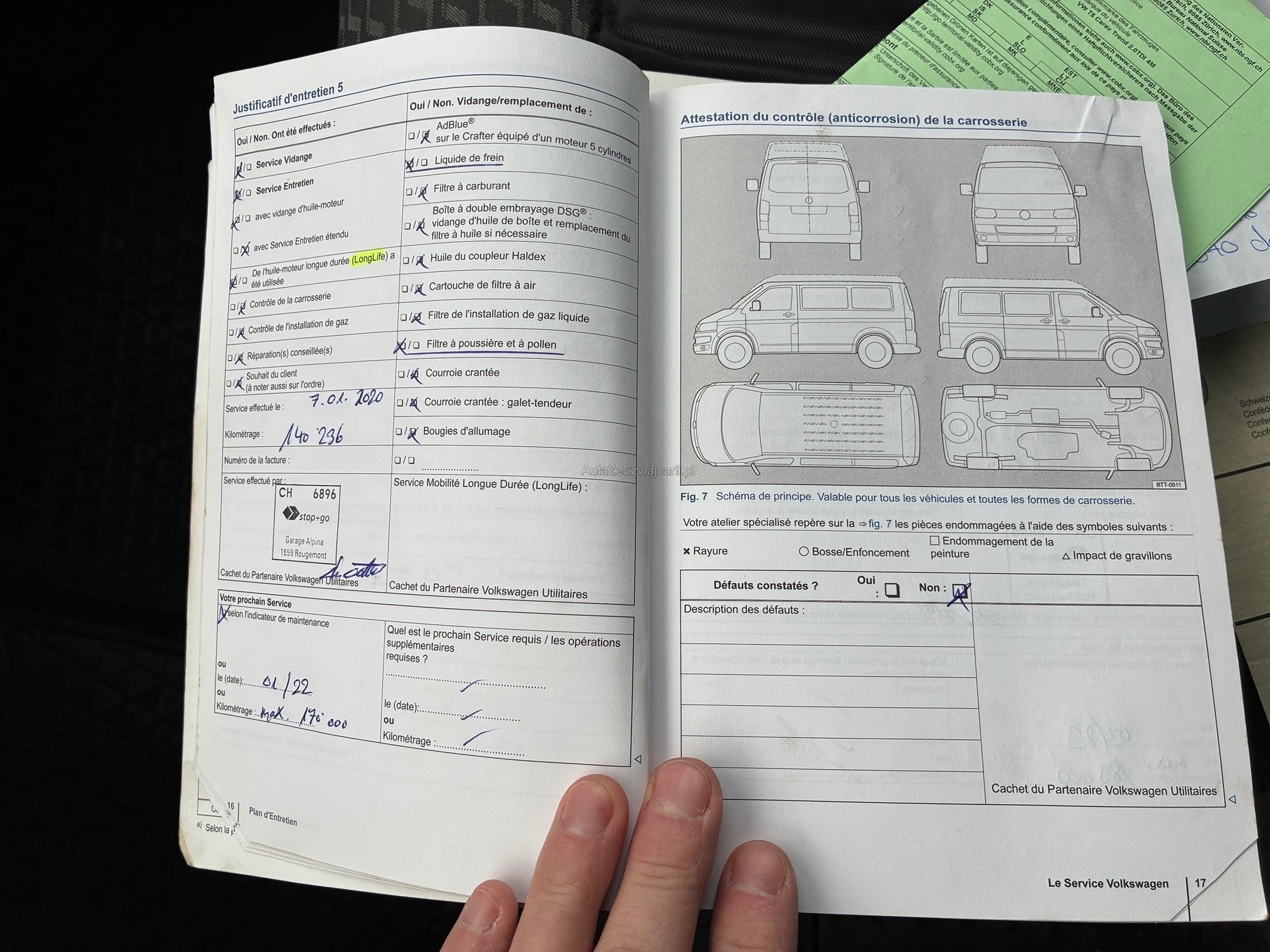 | Kommentar | Fahrzeug war kürzlich bei uns im Service. Dabei wurden folgende Arbeiten ausgeführt: - Inspektion mit Oelwechsel - Oel für Haldex-Kupplung und Dieselfilter ersetzt - DPF gemessen -> i.o (siehe Zertifikat) - Kardanwelle ersetzt Seit kurzem leuchtet zeitweise die Motorlampe. Gem. Fehlerspeicher funktioniert die Turboladerverstellung nicht ordnungsgemäss. Nach Neustart teils wieder i.o. Für definitive Problemlösung müsste der Turbolader ersetzt werden. Für anstehende MFK müsste sehrw. die Bremsen vorne ersetzt werden. Ansonsten steht einer erfolgreichen MFK nichts mehr im Wege. Es wurde keine abschliessende Beurteilung vorgenommen. - Lückenloses Serviceheft - Zahnriemen und Wasserpumpe wurde bei Km 208'000 (07.2023) ersetzt. - 3 Sitzreihe wurde demontiert - ist jedoch vorhanden und wird beim Verkauf montiert / mitgegeben |