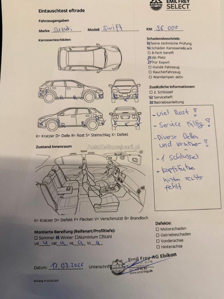 | Information | Fahrzeug mit viel Rost unten!! 1 Schlüssel vorhanden! Diverse Dellen + Kratzer! Kopfstütze hinten rechts fehlt! Service fällig! |