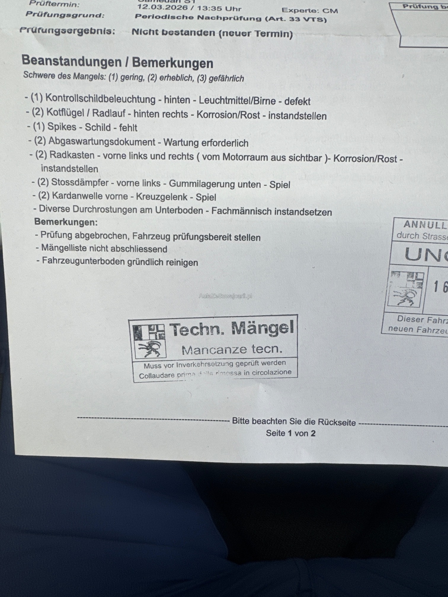 | Kommentar | MFK Mängel siehe Prüfbericht Für sichtbare sowie nicht sichtbare Mängel wird keinerlei Haftung übernommen! Jegliche Ansprüche auf Wandelung oder Minderung sind ausdrücklich ausgeschlossen! |
