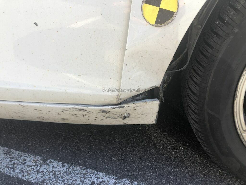 Danno da collisione ant. dx, deformato parafango ant. dx, porta ant. dx e sottoporta dx con rivestimento sottoporta lacerato con giroruota.