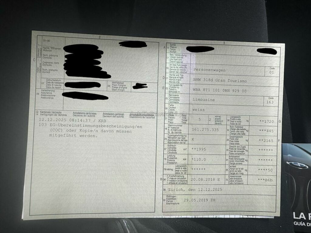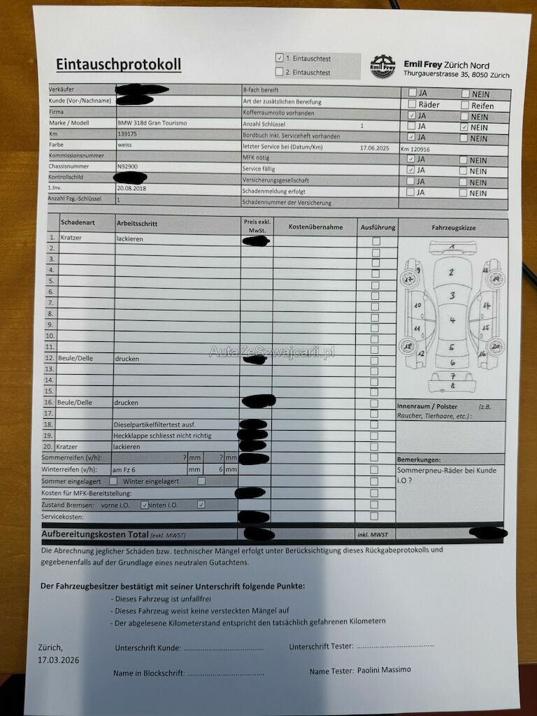 | Information | Keine technische Prüfung (Werkstatttest) vorgenommen Diverse Schäden an Karosserie/Lack. Fahrzeug ab Platz, ohne Garantie und Aufbereitung. Keine Gewähr auf die Angaben der Sonder- und Serienausstattung / keine mechanische Prüfung. Fahrzeug wurde unzerlegt expertisiert / keine Haftung für allfällige, nach Demontage bekanntwerdenden Mängel. Fahrzeugbereifung und Ausstattung gemäss Fotos / Fahrzeugkauf auf eigenes Risiko ab Platz ohne Nachwährschaft. - Diverse Dellen und Kratzer am gesamten Fahrzeug - Stossstange unten verkratzt - Heckklappe schliesst nicht richtig - Dieselpartikelfiltertest ausführen - Letzter Service am 17.06.2025bei 120916 Km |