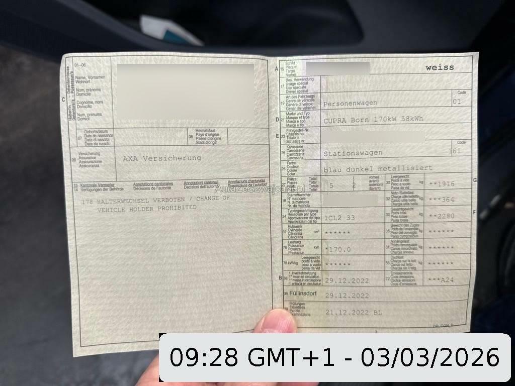 | Sonderausstattung | Paket: CUPRA Sportschalensitze in Dinamica "Granite Grey" (Sitze: Mittelarmlehne hinten, Sitze: CUPRA Sport Schalensitze in Dinamica "Granite Grey", Sitze: Fahrer- und Beifahrersitz mit Massagefunktion, Scheibenwaschdüsen beheizt, Sitze: Elektrische Sitzverstellung für Vordersitze, Sitze: Sitzheizung für Vordersitze, getrennt regelbar, Sitze: Fahrer- und Beifahrersitz mit Lendenwirbelstütze), Paket: CUPRA BORN ADVANCED PACK LIGHT (Paket: CUPRA Sportschalensitze in Dinamica "Granite Grey", Privacy Abgedunkelte Scheiben ab B-Säule hinten, Paket: Tech L, Augmented Reality Head-up-Display, Paket: Pilot M), Paket: Pilot M (Assist: Rückfahrkamera, Assist: Fernlichtassistent, Assist: Traffic sign recognition (Verkehrszeichenerkennung), Media: CUPRA Navigationssystem, Assist: Prädiktive automatische Distanzregelung ACC), Garantie: Cupra Hersteller-Garantieverlängerung für das 3., 4. und 5. Jahr / max.100’000 km (ab 1. Inv.), Media: BeatsAudio- Sound System - Subwoofer; 395 Watt Leistung 9 High-End-Lautsprecher, Räder: Alufelgen 7.5J x 20", "BLIZZARD" 31/4 in Glossy Black / Copper (215/45 R20), Skyline Panoramadach, Lackierung: Spezial Metallic-Lackierungen, Wärmepumpe |