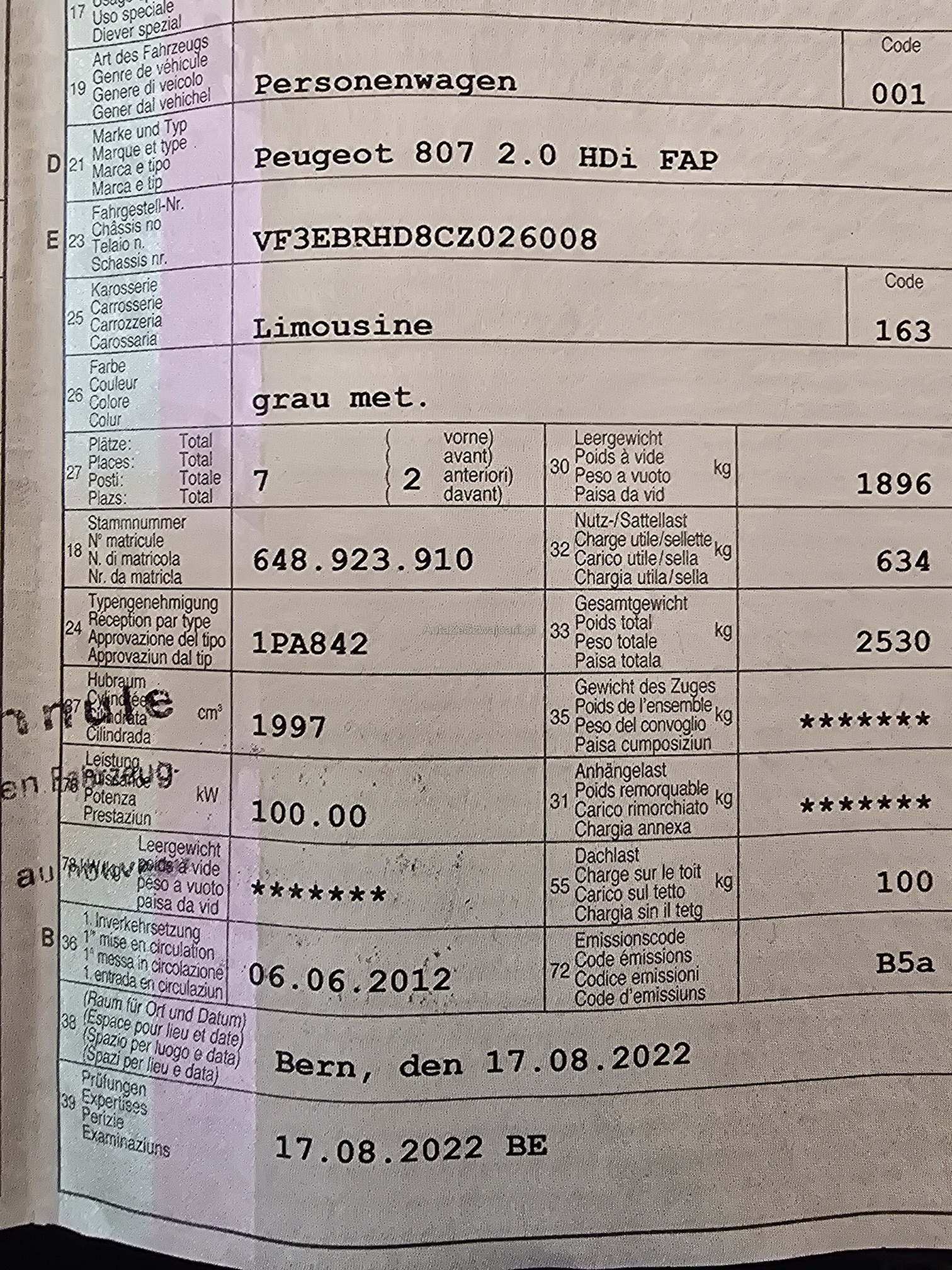 | Kommentar | Fahrzeug hat Hagelschaden. Fahrzeug fährt sich gut. Keine weiteren Tests durchgeführt. |