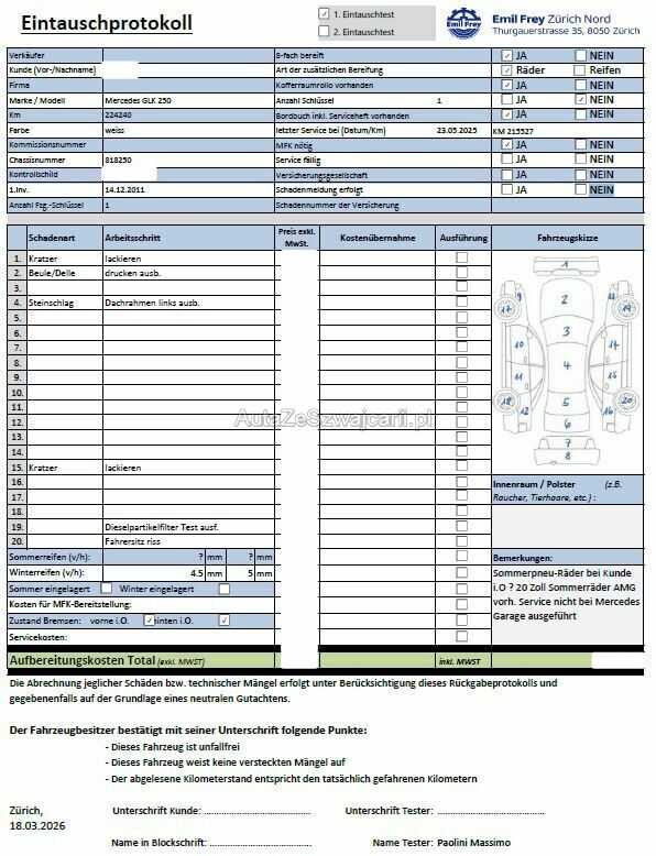 | Information | Keine technische Prüfung (Werkstatttest) vorgenommen Diverse Schäden an Karosserie/Lack. Fahrzeug ab Platz, ohne Garantie und Aufbereitung. DPF/FAP Filter nicht kontrolliert Keine Gewähr auf die Angaben der Sonder- und Serienausstattung / keine mechanische Prüfung. Fahrzeug wurde unzerlegt expertisiert / keine Haftung für allfällige, nach Demontage bekanntwerdenden Mängel. Fahrzeugbereifung und Ausstattung gemäss Fotos / Fahrzeugkauf auf eigenes Risiko ab Platz ohne Nachwährschaft. - Div. Kratzer und Dellen - Steinschlag auf dem Dachrahmen - Riss beim Fahrersitz - 8-Fach bereift |