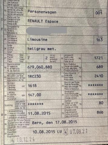 | Condition_and_Equipment | Zustand Fahrzeug ist rollbar. Bereifung Fahrzeug wird mit Winterräder abgegeben. --- Rechts Anstoss rechts im Bereich der A-Säule. Front Front rechts eingedrückt. Radhaus vorne rechts eingedrückt / gestaucht. --- Serienaustattung Airbag Fahrer und Beifahrerseite Elektrische Fensterheber vorne + hinten ASR Antriebsschlupfregelung Seitenairbag Fahrer und Beifahrerseite ESP Elektronisches Stabilitätsprogramm Reflektierende Frontscheibe ABS und EBV Elektr. Bremskraftverteilung Deaktivierung Beifahrerairbag Isofix-Kindersitzbefestigung Sonnenstoren 2. Reihe Kopfairbag 1. und 2. Reihe Zwei Zonen-Klimaautomatik Tempomat mit Geschwindigkeitsbegrenzer Automatisch abblendbarer Innenspiegel Dunkle Verglasung hinten Elektronische Servolenkung Regen- und Lichtsensor Bluetooth-System Panorama-Glasdach Sitzbezüge in Stoff/ Kunstleder Aussenspiegel elektrisch und automatisch anklappbar Renault Chipkarte Keyless-Drive Hands-free Fussmatten vorn und 2. Sitzreihe Berganfahrhilfe Einparkhilfe vorne und hinten Reifenreparatur-Kit Stop + Start System LED-Scheinwerfer Lederlenkrad Nappa Spurhalteassistent LDW Keine Gewähr auf die Angaben der Serienausstattungen Abstandswarnung Vordersitze mit Lendenwirbelstütze Toter-Winkel-Assistent Automatische Notbremsung Digitaler Radioempfang DAB+ R-Link/ Navi Verkehrsschild-Erkennungssystem Sonderausstattung Fahrersitz elektrisch verstellbar Metallic-Lackierung Rückfahrkamera Heizbare Vordersitze 2 Zusatzsitze hinten Notrad Ausstattung Klimaanlage Leichtmetall-Felgen Navigationsgerät Rückfahrkamera Rückfahrsensoren Tempomat Metallic-Lackierung ABS (Anti-Blockier-System) Sonstige Ausstattung und Zubehör Dachträger |