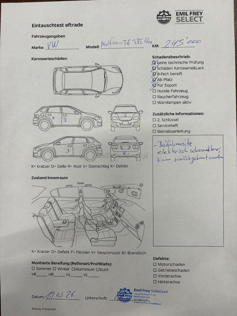 | Information | -Beifahrersitz elektrisch schwenkbar (kann Zurückgebaut werden, Material vorhanden) -Standheizung, Rückfahrkamera, Parksensoren, Highline -Keine technische Prüfung (Werkstatttest) vorgenommen -Diverse Schäden an Karosserie/Lack. -8-fach bereift. -Fahrzeug ab Platz, ohne Garantie und Aufbereitung. -Fahrzeug ist für Export |