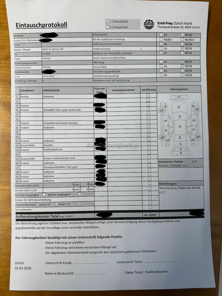 | Information | Keine technische Prüfung (Werkstatttest) vorgenommen Diverse Schäden an Karosserie/Lack. Fahrzeug ab Platz, ohne Garantie und Aufbereitung. Keine Gewähr auf die Angaben der Sonder- und Serienausstattung / keine mechanische Prüfung. Fahrzeug wurde unzerlegt expertisiert / keine Haftung für allfällige, nach Demontage bekanntwerdenden Mängel. Fahrzeugbereifung und Ausstattung gemäss Fotos / Fahrzeugkauf auf eigenes Risiko ab Platz ohne Nachwährschaft. - Diverse Dellen und Kratzer am gesamten Fahrzeug - Stossstange vorne ersetzten - Rechts hinten Tür verkratzt und beule - Radlaufband lackieren - Partikelfilter musste nicht durchgeführt werden Grund wegem alter |