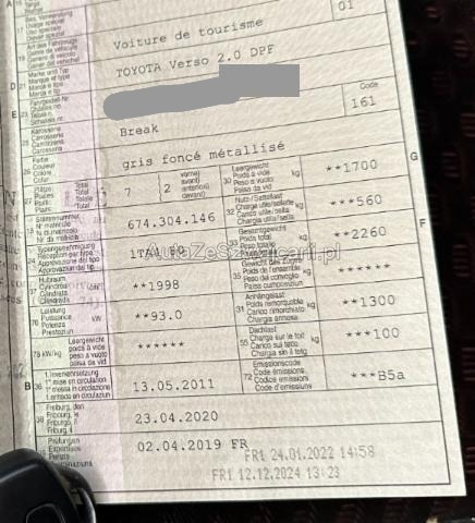 | Condition_and_Equipment | Demontage Persönliche Gegenstände oder Ladegut im Fahrzeug werden entfernt. Zustand Fahrzeug muss transportiert werden (Höhe und Breite beachten). Fahrzeug ist NICHT fahrbar. Fahrzeug ist NICHT rollbar. Schlüssel Nur ein Schlüssel vorhanden. --- Rechts Rechte Seite beschädigt. Anstoss rechts im Bereich der B-Säule. Innenraum Dachhimmel gerissen. Sonstige Schäden Div.Carrosserie Teile sind leicht beschädigt. Lackierung matt (stumpf, beschädigt). --- Serienaustattung Airbag Fahrer und Beifahrerseite Elektrische Fensterheber vorne + hinten Tempomat Seitenairbag Fahrer und Beifahrerseite Nebelscheinwerfer Zentralverriegelung mit Fernbedienung Lenkrad verstellbar Kopfairbag vorne und hinten Lederschaltknauf Audiofernbedienung am Lenkrad Stabilitätskontrolle VSC + Traktionskontrolle TRC Servolenkung elektrisch Dachkonsole mit Spiegel Reifenreparaturset mit Kompressor Frontsitze mit Schleudertrauma-Schutzsystem WIL Knieairbag Fahrer Dieselpartikelfilter Aussenspiegel el.verstell- u. heizbar/ Einstiegsbeleuchtung Isofix-Kindersitzbefestigung hinten Klimaanlage manuell Stahlfelgen 16" Klapptische an den Rücklehnen der Vordersitze AUX-Anschluss Berganfahrhilfe Fahrersitz höhenverstellbar Multi-Informationsdisplay/ Bordcomputer Rücksitze verschiebbar 2. Reihe/ Easy Flat-System ABS und EBD Elektr. Bremskraftverteilung inkl. BA Radio/ CD/ MP3/ 6 Lautsprecher inkl. Bluetooth Keine Gewähr auf die Angaben der Serienausstattungen Sonderausstattung Metallic-/ Mica Lackierung 4 Winterräder 16"/ Stahlfelgen |