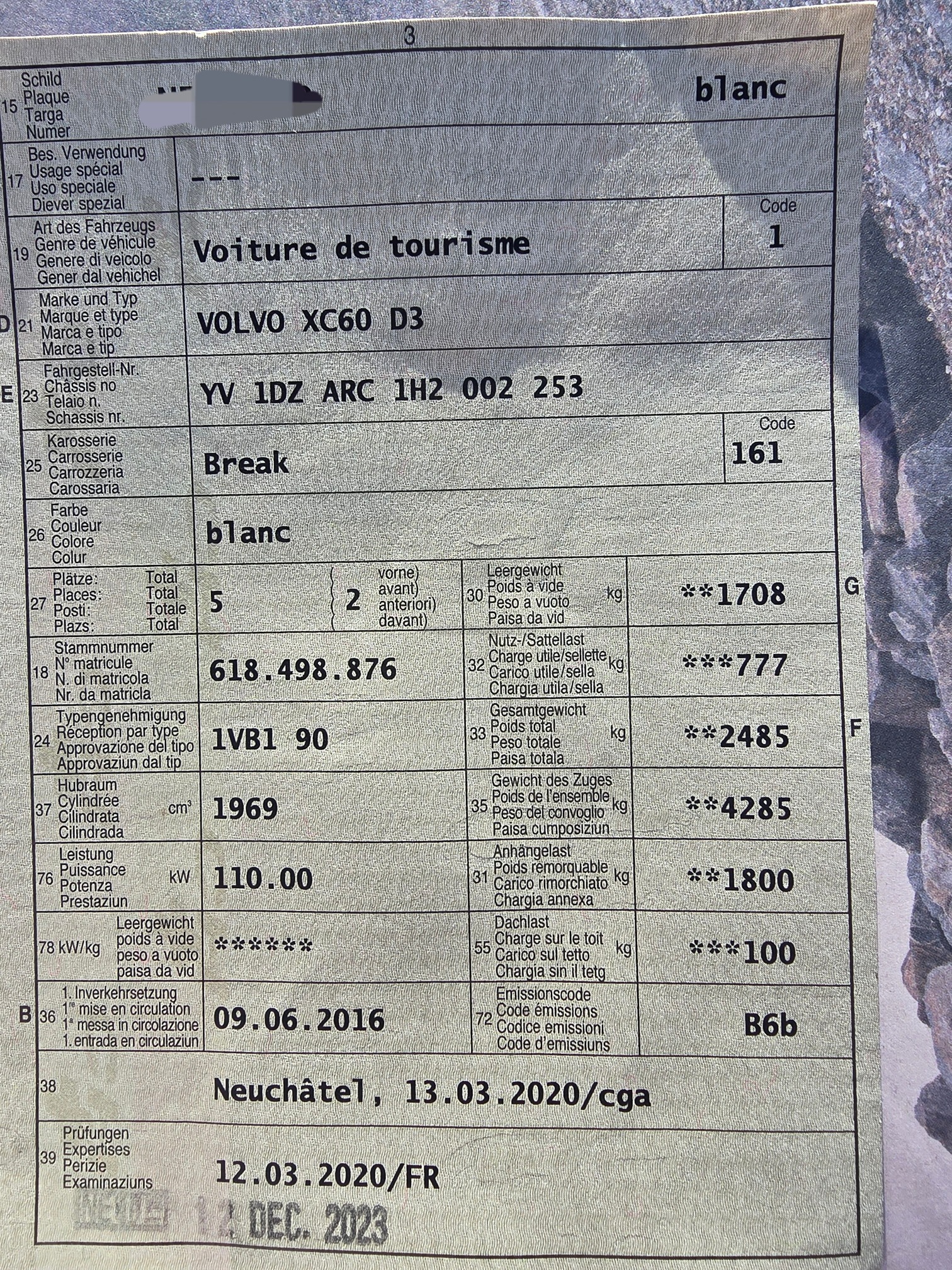 | Kommentar | Nous n'avons pas effectué de test de reprise. Nous avons contrôlé le filtre à particules qui est à remplacer |