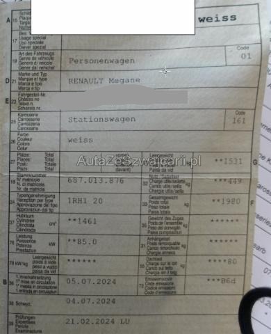 | Condition_and_Equipment | Zustand Fahrzeug ist NICHT fahrbar. Fahrzeug ist rollbar. --- Rechts Rechte Seite beschädigt. Heck Heck rechts eingedrückt. Innenraum Gurtstraffer vorne ausgelöst. Gurtstraffer hinten ausgelöst. Weitere Beschädigungen Sihe Fotos --- Serienaustattung Airbag Fahrer und Beifahrerseite Elektrische Fensterheber vorne Aussenspiegel elektrisch verstellbar und heizbar Dachreling Seitenairbag Fahrer und Beifahrerseite Nebelscheinwerfer Multifunktionslenkrad Elektrische Fensterheber hinten Deaktivierung Beifahrerairbag Windowbags vorne + hinten ABS und EBV Elektr. Bremskraftverteilung inkl. BA Leichtmetallfelgen 17" Zwei Zonen-Klimaautomatik Rückfahrkamera Tempomat mit Geschwindigkeitsbegrenzer Automatisch abblendbarer Innenspiegel Dunkle Verglasung hinten Dieselpartikelfilter Kindersitzverankerung ISOFIX hinten Sitzbezüge in Stoff/ Kunstleder Automatische Parkbremse Renault Chipkarte Keyless-Drive Hands-free Licht- und Regensensor Berganfahrhilfe Fahrersitz höhenverstellbar Einparkhilfe vorne und hinten Beifahrersitz höhenverstellbar Bluetooth mit USB-Audio-Schnittstelle Reifenreparatur-Kit Stop + Start System LED-Scheinwerfer Aussenspiegel elektrisch einklappbar Sitzbank hinten 1/3 - 2/3 umklappbar Keine Gewähr auf die Angaben der Serienausstattungen Aktiver Spurhalteassistent LKAS Adaptiver Fernlichtassistent Digitale Instrumentierung Digitaler Radioempfang DAB+ ASR und ESC/ Antriebsschlupf- und Stabilitätsprogramm Fahrersitz mit Lendenwirbelstütze verstellbar Verkehrsschild-Erkennungssystem Connect Apple Car Play/ Android Auto Müdigkeitserkennung Fussgängererkennung Multimediasystem 9.3" Ausstattung Klimaanlage Leder-Ausstattung Leichtmetall-Felgen Navigationsgerät Rückfahrkamera Rückfahrsensoren |