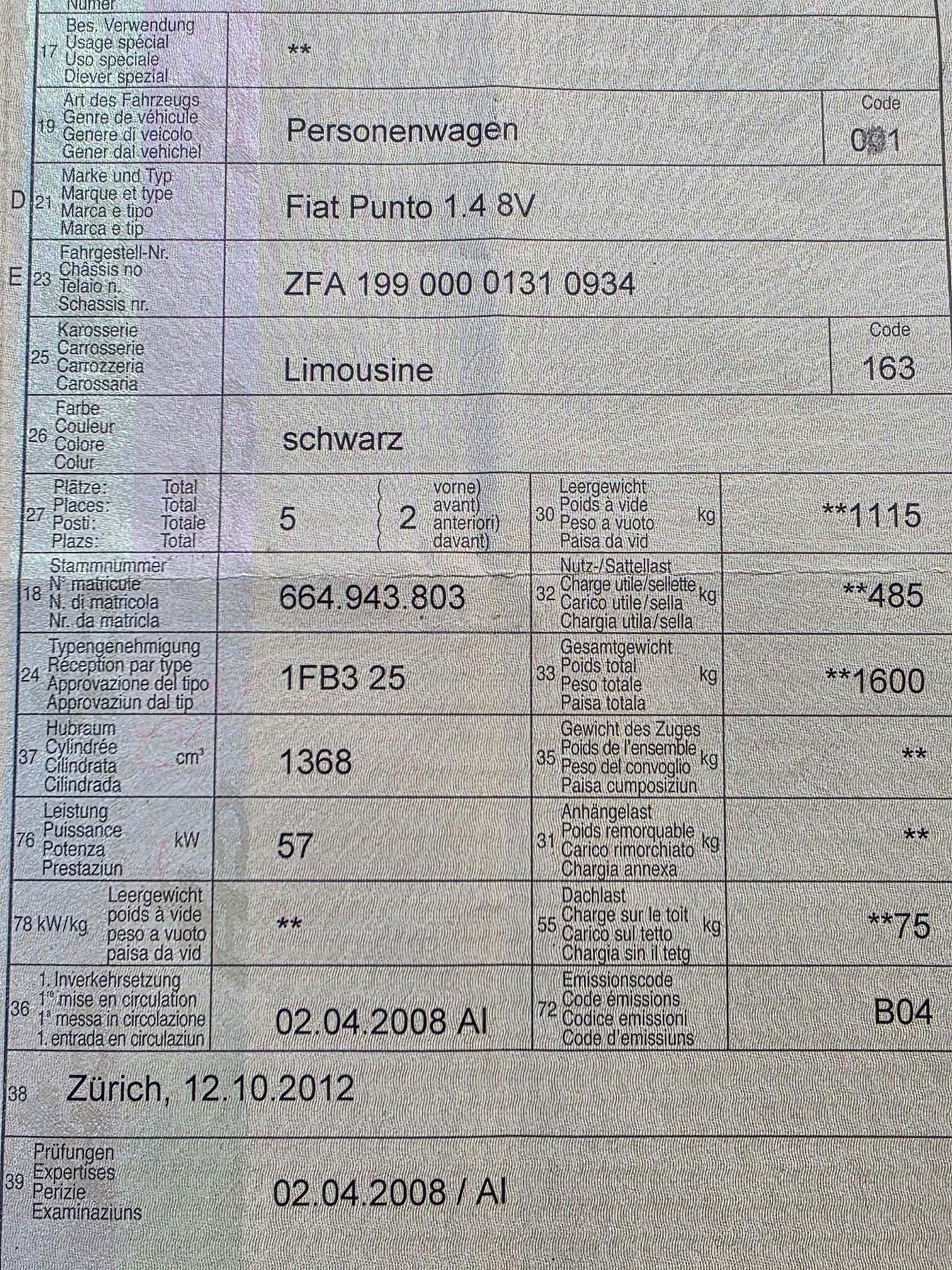 | Kommentar | Fahrzeug wurde nicht getestet, weitere Mängel möglich. Leichter Hagelschaden auf dem Dach. Kupplung kommt bald. Von einer älteren Dame gefahren. |