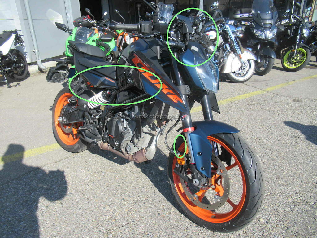 Lenker, Lampenträger, Tacho, Spiegel links und rechts verbogen, Felge deformiert, Tank deformiert,Fusstritt rechts, Verschallung rechts Kratzer