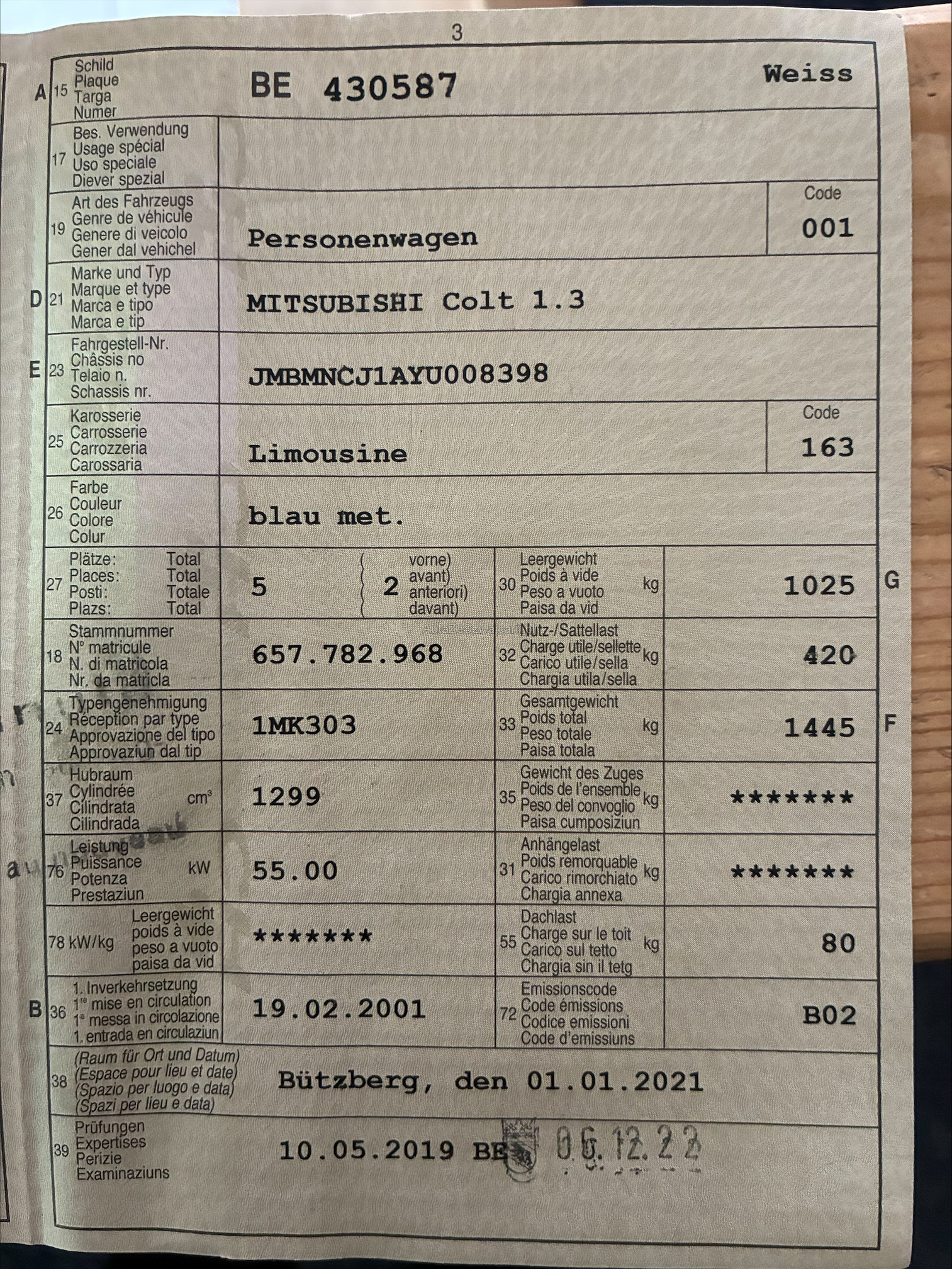 | Kommentar | Im Kundenauftrag zu Verkaufen Gut erhaltener Colt Läuft Mechanisch i.o Klimaanlage i.o Ein Rostloch Radlauf unten seitlich. Am Fahrzeug wurde keine vollumfängliche Prüfung der mechanischen Teile und der Carrosserie durchgeführt! Das Risiko liegt somit vollumfänglich beim Käufer. Um Missverständnisse zu vermeiden kann das Fahrzeug auf Voranmeldung besichtigt & getestet werden. Wird davon bewusst kein Gebrauch gemacht, liegt die Verantwortung beim Käufer. Nach Zuschlag, keine Nachverhandlungen möglich. Fahrzeug ab Platz ohne jegliche Garantie und Nachwährschaft. |