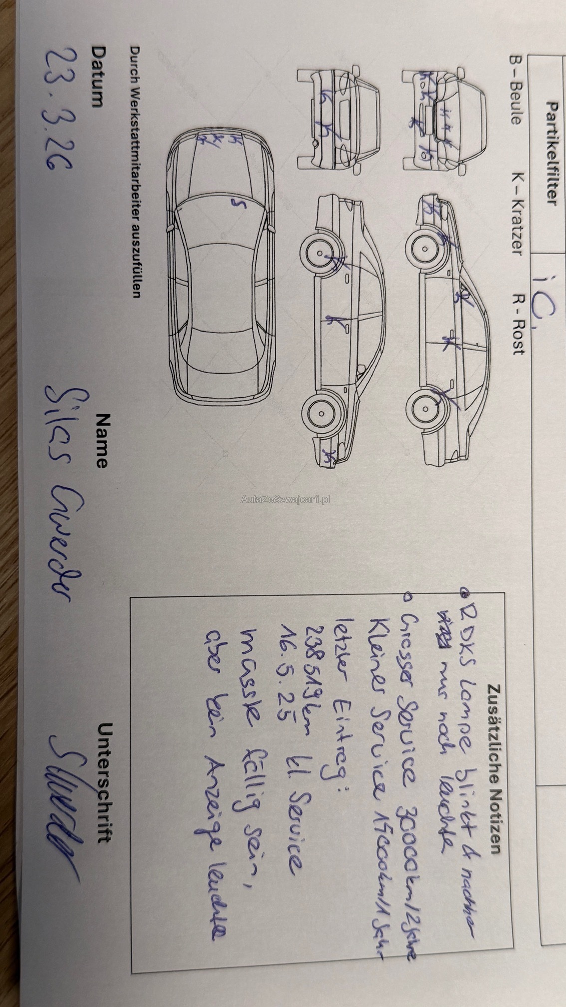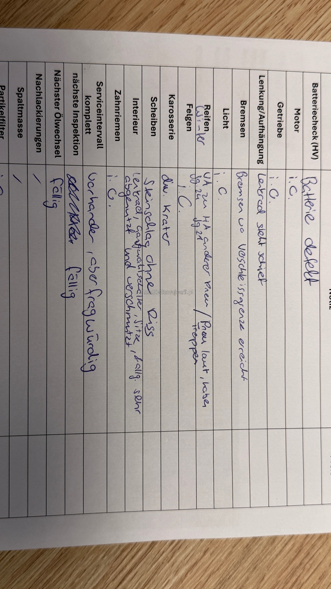| Kommentar | Fahrzeug ist noch im Kundenbesitz und wird gefahren Werkstattest wurde durchgeführt Siehe Eintauchtest. Wapu 05.25 Wurde erneuert. Bremsen Hinten im 2025 erneuert FHZ hat Gebrauchspuren |