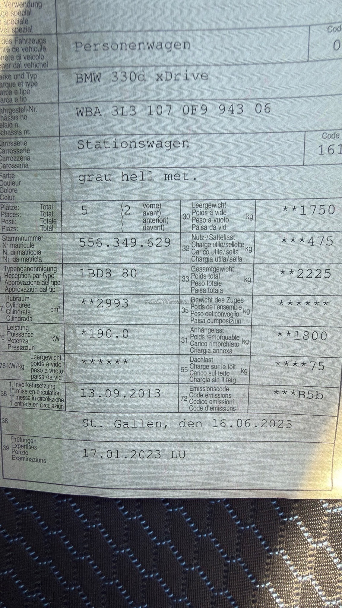 | Kommentar | Diesel-Hochdrucksystem defekt, nicht fahrbar. Fahrzeug hatte Panne. Cat Code Bezeichung Preise inkl. MwSt. 8.0% M 3L31 330d xDrive 67100.00 P 0A83 GLACIERSILBER METALLIC 1160.00 F HAAT STOFF HEXAGON ALCANTARA/ANTHRAZIT 0.00 S 01CA SELEKTION COP RELEVANTER FAHRZEUGE 0.00 S 0230 EU SPEZIFISCHE ZUSATZUMFAENGE 0.00 S 0249 MULTIFUNKTION FUER LENKRAD 0.00 S 0258 BEREIFUNG MIT NOTLAUFEIGENSCHAFTEN 0.00 S 02PA RADSCHRAUBENSICHERUNG 0.00 S 02PF 19"M LM RAEDER STERNSP.403 M/MB 990.00 S 02TB SPORT-AUTOMATIK GETRIEBE 350.00 S 02VF ADAPTIVES M FAHRWERK 980.00 S 02VL VARIABLE SPORTLENKUNG 280.00 S 0302 ALARMANLAGE 660.00 S 0320 MODELLSCHRIFTZUG ENTFALL 0.00 S 0322 KOMFORTZUGANG 790.00 S 0337 M SPORTPAKET 5650.00 S 03AC ANHAENGERKUPPLUNG 1380.00 S 03AG RUECKFAHRKAMERA 580.00 S 03AT DACHRELING ALUMINIUM SATINIERT 450.00 S 0420 SONNENSCHUTZVERGLASUNG 540.00 S 0423 FUSSMATTEN IN VELOURS 0.00 S 0428 WARNDREIECK 0.00 S 0430 INNEN- UND AUSSENSPIEGELPAKET 810.00 S 0431 INNENSPIEGEL,AUTOMATISCH ABBLENDEND 0.00 S 0459 SITZVERSTELLUNG, ELEKTR.MIT MEMORY 1520.00 S 0465 DURCHLADESYSTEM 0.00 S 0481 SPORTSITZE FUER FAHRER/BEIFAHRER 0.00 S 0488 LORDOSENSTUETZE FAHRER/BEIFAHRER 430.00 S 0493 ABLAGENPAKET 290.00 S 0494 SITZHEIZUNG FUER FAHRER/BEIFAHRER 510.00 S 04AD INTERIEURL. ALU. LAENGSSCHLIFF FEIN 0.00 S 04AE ARMAUFLAGE VORNE VERSCHIEBBAR 210.00 S 04DL AKZENTLEISTEN SCHWARZ HOCHGLAENZEND 0.00 S 0502 SCHEINWERFER-WASCHANLAGE 0.00 S 0508 PARK DISTANCE CONTROL (PDC) 1090.00 S 0520 NEBELSCHEINWERFER 0.00 S 0521 REGENSENSOR 180.00 S 0522 XENON-LICHT 1350.00 S 0524 ADAPTIVES KURVENLICHT 800.00 S 0534 KLIMAAUTOMATIK 0.00 S 0548 KILOMETERTACHO 0.00 S 0563 LICHTPAKET 260.00 S 0575 ZUSAETZLICHE 12-V-STECKDOSE 0.00 S 05AC FERNLICHTASSISTENT 0.00 S 05AG SPURWECHSELWARNUNG 770.00 S 05AL ACTIVE PROTECTION 480.00 S 05AS DRIVING ASSISTANT 720.00 S 05DA BEIFAHRERAIRBAG-DEAKTIVIERUNG 0.00 S 05DC FONDKOPFSTUETZEN KLAPPBAR 80.00 S 05DF AKTIVE.GESCHW.REG.+STOP&GO FUNKT. 1470.00 S 05DL SURROUND VIEW 1020.00 S 0609 NAVIGATIONSSYSTEM PROFESSIONAL 3430.00 S 0610 HEAD-UP DISPLAY 1350.00 S 0654 DAB TUNER 440.00 S 0688 HARMAN/KARDON SURROUND SOUND SYSTEM 1500.00 S 0698 AREA-CODE 2 0.00 S 06AC INTELLIGENTER NOTRUF 0.00 S 06AE TELESERVICES 0.00 S 06AK CONNECTEDDRIVE SERVICES 480.00 S 06AM REAL TIME TRAFFIC INFORMATION 210.00 S 06AR INTERNET 140.00 S 06NH FREISPRECHEIN. M. USB-SCHNITTSTELLE 0.00 S 06NR APPS 0.00 S 06WA INSTRUMENTENKOMBI. M. ERW. UMF. 0.00 S 0710 M LEDERLENKRAD 0.00 S 0715 M AERODYNAMIKPAKET 0.00 S 0760 M HOCHGLANZ SHADOW LINE 0.00 S 0775 M DACHHIMMEL ANTHRAZIT 0.00 S 0854 SPRACHVERSION FRANZOESISCH 0.00 S 0881 FRANZOESISCH / BORDLITERATUR 0.00 S 08KA OELWARTUNGSINT. 30.000KM/24MONATE 0.00 S 08TH SPEED LIMIT INFO 440.00 S 08V1 HINWEISSCHILD NCAP 0.00 S 0962 KENNZEICHENTRAEGER VORNE ENTFALL 0.00 Total Sonderausstattung 33790.00 Total Neupreis 100890.00 |