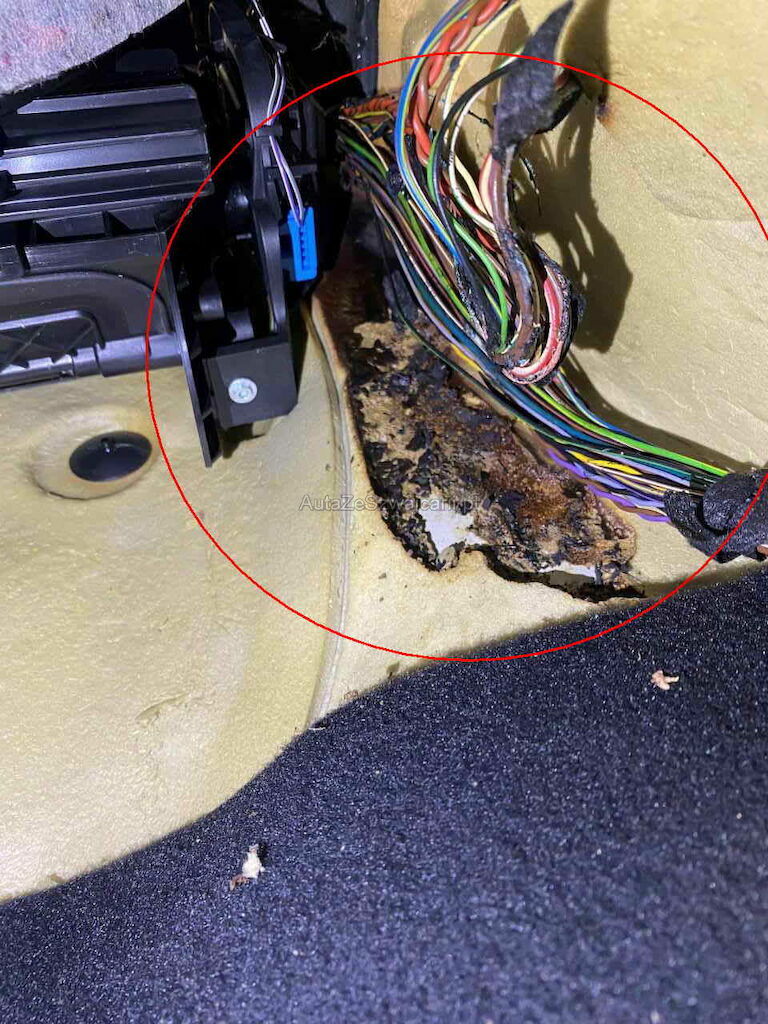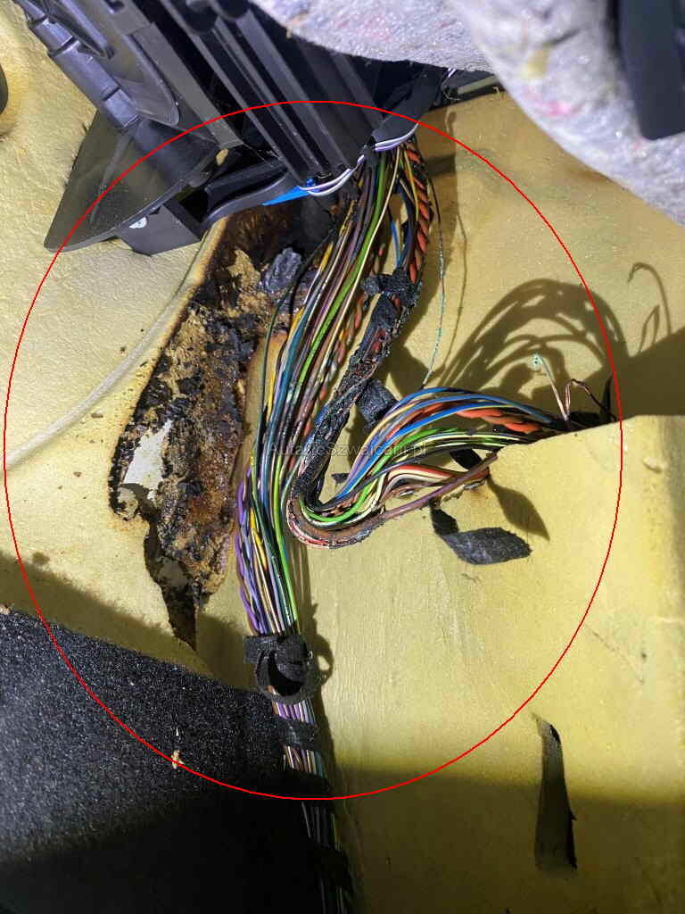 Kabelbrand am Türkabelstrang rechts und als Folgeschaden wurde der Hauptkabelstrang und diverse Dämmatten beschädigt. Diversers Fehler auf der Fahrzeugelektronik
