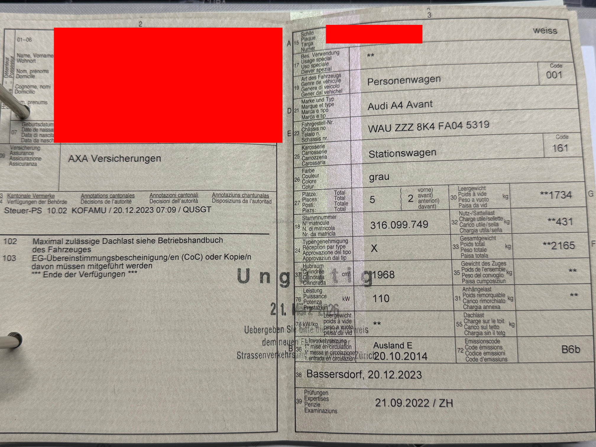 | Kommentar | Das Fahrzeug befindet sich technisch in einem guten Zustand und ist fahrbereit. Bremsen und Reifen sind in Ordnung, Fahrzeug ist regelmässig gewartet. Eine detaillierte Werkstattprüfung wurde dennoch nicht durchgeführt. Die vorhandenen Karosserieschäden sind auf den Bildern ersichtlich. Verkauf ab Platz, ohne Garantie und ohne Gewährleistung. Der Käufer übernimmt das Fahrzeug auf eigenes Risiko. Das Fahrzeug ist innert 7 Tagen nach Zuschlag abzuholen. |
