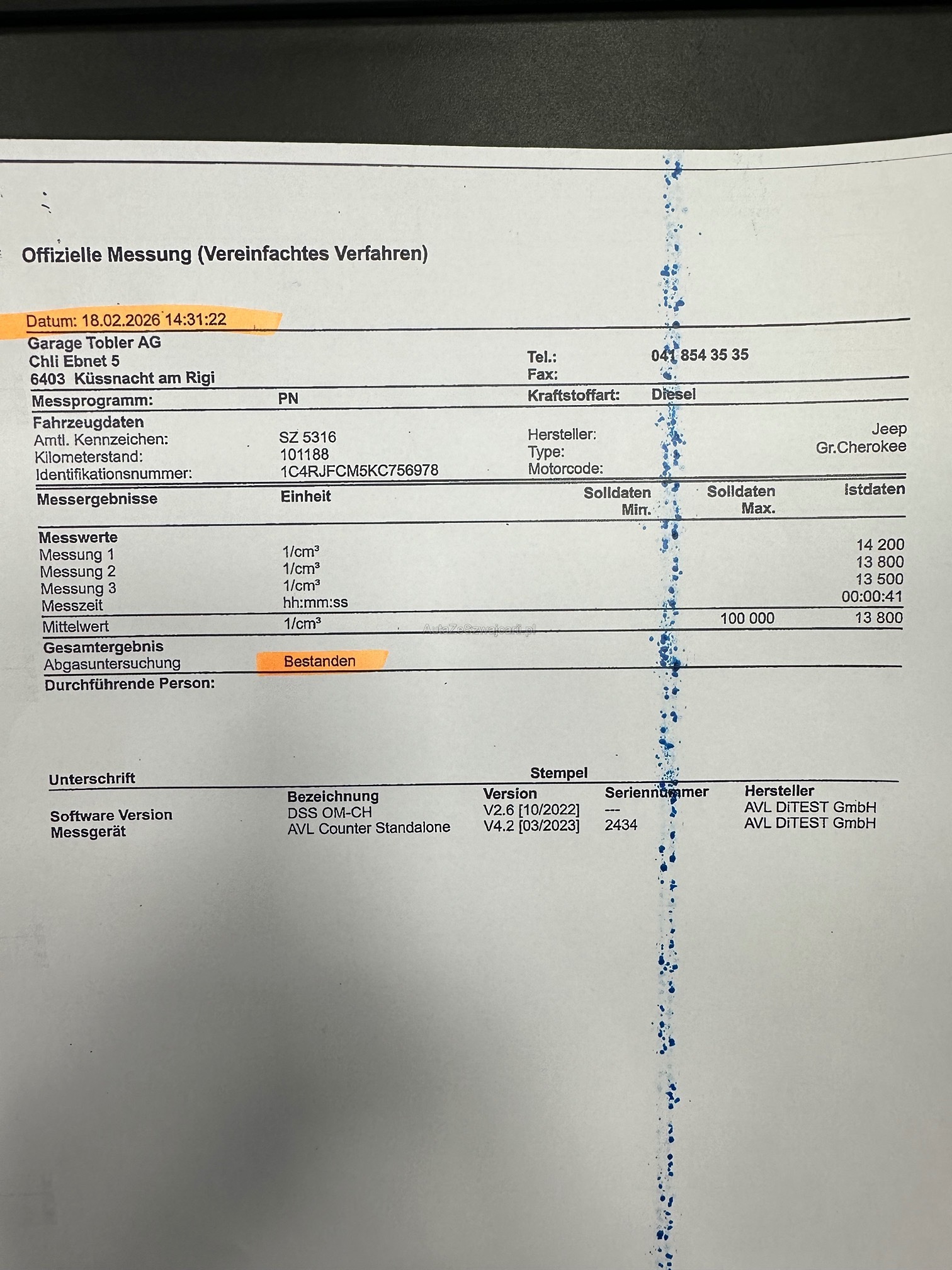 | Kommentar | Partikelfilter Test am 18.02.2026 km 101'185 durchgeführt und bestanden - siehe Foto Ausdruck / Sommerpneu auf original Felgen gehören auch noch dazu / siehe Foto Radio Bildschirm ! / Am Fahrzeug wurde keine Werkstattprüfung durchgeführt. Für sichtbare oder nicht sichtbare Mängel wird keine Haftung übernommen. Das Risiko liegt vollständig beim Käufer / KM Stand +/- da Kunde weiter fährt |