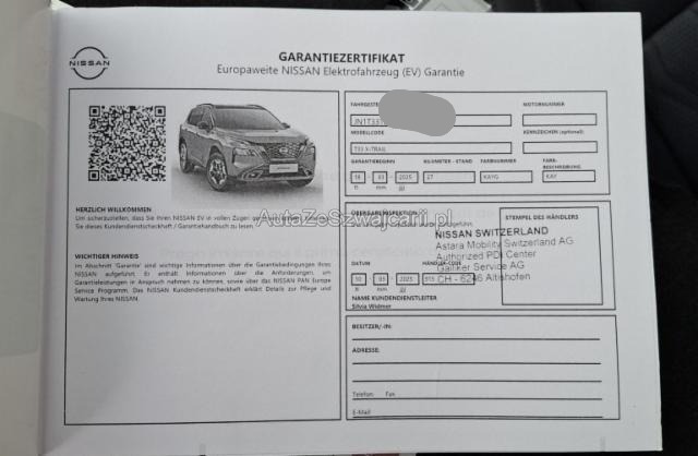 | Condition_and_Equipment | Bereifung Fahrzeug wird mit Winterräder abgegeben. Schlüssel Nur ein Schlüssel vorhanden. --- Elektrik Risiko Steuergeräte. Weitere Beschädigungen Am Fahrzeug Nissan X?Trail wurde die Frontscheibe ersetzt. Nach dem Austausch zeigte sich, dass die Scheibe nicht fachgerecht und nicht vollständig dicht eingebaut wurde. Durch die unzureichende Abdichtung kam es zu einem Wassereintritt im vorderen Fahrzeugbereich. Der eingedrungene Wasserfluss führte zu einer Beeinträchtigung der elektrischen Systeme, insbesondere im Bereich der Hochvoltkomponenten. Infolge der Durchfeuchtung reagierten die Hochvoltbatterie sowie weitere elektrische Steuergeräte und Komponenten nicht mehr. Das Fahrzeug lässt sich seit dem Wassereintritt nicht mehr starten bzw. hochfahren, und die Hochvoltanlage bleibt inaktiv. --- Serienaustattung Airbag Fahrer und Beifahrerseite Sitzheizung vorne Elektrische Fensterheber vorne + hinten ESP Elektronisches Stabilitätsprogramm Lederlenkrad Innenspiegel automatisch abblendbar Scheibenwischer mit Regensensor Leichtmetallfelgen 18" Park-Distanz-Sensor vorne + hinten Lichtsensor Aussenspiegel elektrisch verstellbar/ heizbar und anklappbar Rücksitze geteilt umklappbar 60/40 Kindersitz-Vorbereitung Isofix Lenkrad beheizbar Dunkelgetönte Scheiben hinten Intelligent Key-System Zwei Zonen-Klimaautomatik Rückfahrkamera Vorhangairbags ABS/ EBD Sonnenschutzrollo für Seitentüren hinten Seitenairbags Dachreling silber Sitzheizung 2. Reihe Elektr. Lendenwirbelstütze Fahrersitz Berganfahrhilfe Fernlichtassistent Bluetooth Interface/ Schnittstelle Reifendruck-Sensoren TPMS LED-Scheinwerfer LED Tagfahrlicht USB-Anschluss Details siehe gültige Preisliste des Importeurs Keine Gewähr auf die Angaben der Serienausstattungen 360° Kamera Audiosystem mit DAB+ Wireless Charging für mobile Geräte Apple Car Play/ Android Auto Ottopartikelfilter Navigation Nissan Connect USB-C Anschluss Center Airbag vorne Pack Fahrerassistenz Sonderausstattung Metallic-Lackierung Ausstattung Metallic-Lackierung |