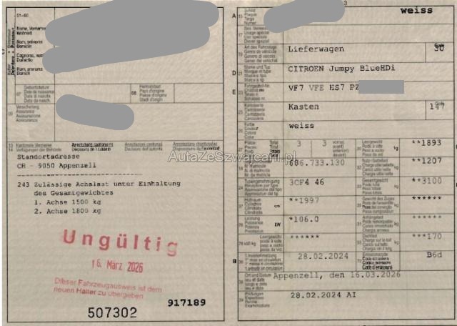 | Condition_and_Equipment | Zustand Fahrzeug ist fahrbar. Fahrzeug ist rollbar. Bereifung Fahrzeug wird mit Winterräder abgegeben. Sonstiges Fahrzeugdokumente vorhanden. Schlüssel Beide Schlüssel vorhanden. Weitere wichtige Hinweise ACHTUNG: ZUSÄTZLICH ZUM RESTWERTGEBOT WIRD EINE HANDLINGS-GEBÜHR VON CHF 500.00 ERHOBEN! ATTENTION : EN PLUS DE L'ENCHÈRE DE VALEUR RÉSIDUELLE, DES FRAIS DE GESTION DE CHF 500.00 CHF SERONT FACTURÉS ! ATTENZIONE: OLTRE ALL'OFFERTA DI VALORE RESIDUO VERRÀ ADDEBITATA UNA COMMISSIONE DI GESTIONE DI CHF 500.00! Der Kilometerstand wurde abgelesen. Gebrauchsspuren und kleinere Vorschäden sind möglich. Keine weitere Bereifung vorhanden. Vor Ort waren: 2 Schlüssel und Ausweis vorhanden. Motor und Getriebe wurde nicht geprüft. Weitere nicht aufgeführte und nicht fotografisch festgehaltene oder verdeckte Schäden sind möglich! --- Elektrik Risiko Steuergeräte. Glas Windschutzscheibe ist gerissen. Sonstige Schäden Div.Carrosserie Teile sind leicht beschädigt. Weitere Beschädigungen Stossstange vorne rechts beschädigt. Kotflügel vorne rechts beschädigt. Beide linken Seitenleisten beschädigt. Stossstange hinten eingedrückt. Dach ist deformiert -siehe Bilder- Türe vorne links Gebrauchsspuren (Kratzer) vorhanden. Türleiste vorne links Gebrauchsspuren (Kratzer) vorhanden. Aussenspiegel rechts Gebrauchsspuren (Kratzer) vorhanden. Hecktürkante links Gebrauchsspuren (Kratzer) vorhanden. Laderraum Gebrauchspuren (Kratzer und Dellen) vorhanden. --- Serienaustattung Airbag Fahrerseite Airbag Beifahrerseite Schiebetüre rechts verblecht Heck-Flügeltüren verblecht ABS + Bremsassistent Erhöhte Nutzlast Park-Distanz-Sensor hinten ESP + Antriebsschlupfregelung ASR Dieselpartikelfilter Reifendruckkontrolle Tempomat und Geschwindigkeitsbegrenzer Klimaanlage manuell Keine Gewähr auf die Angaben der Serienausstattungen Radio/ USB/ Bluetooth/ DAB+ 3 Plätze/ Polsterung Stoff |