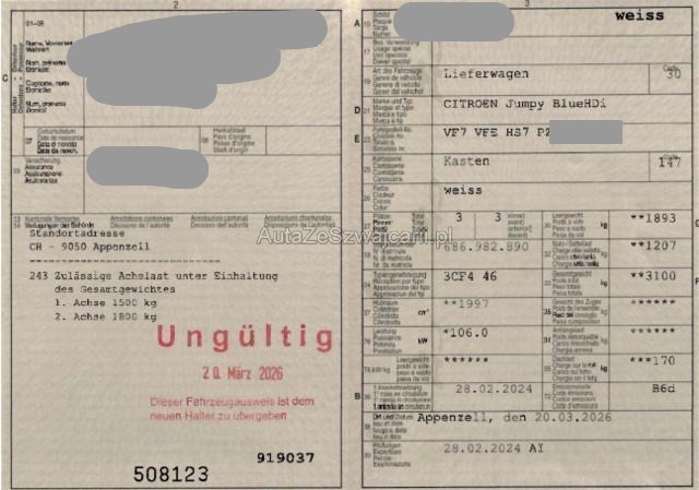 | Condition_and_Equipment | Zustand Fahrzeug ist fahrbar. Fahrzeug ist rollbar. Bereifung Fahrzeug wird mit Winterräder abgegeben. Sonstiges Fahrzeugdokumente vorhanden. Schlüssel Beide Schlüssel vorhanden. Weitere wichtige Hinweise ACHTUNG: ZUSÄTZLICH ZUM RESTWERTGEBOT WIRD EINE HANDLINGS-GEBÜHR VON CHF 500.00 ERHOBEN! ATTENTION : EN PLUS DE L'ENCHÈRE DE VALEUR RÉSIDUELLE, DES FRAIS DE GESTION DE CHF 500.00 CHF SERONT FACTURÉS ! ATTENZIONE: OLTRE ALL'OFFERTA DI VALORE RESIDUO VERRÀ ADDEBITATA UNA COMMISSIONE DI GESTIONE DI CHF 500.00! Der Kilometerstand wurde abgelesen. Gebrauchsspuren und kleinere Vorschäden sind möglich. Keine weitere Bereifung vorhanden. Vor Ort waren: 2 Schlüssel und Ausweis vorhanden. Motor und Getriebe wurde nicht geprüft. Weitere nicht aufgeführte und nicht fotografisch festgehaltene oder verdeckte Schäden sind möglich! --- Elektrik Risiko Steuergeräte. Sonstige Schäden Div.Carrosserie Teile sind leicht beschädigt. Weitere Beschädigungen Mehrere Steinschläge OHNE Risse in der Frontscheibe vorhanden -siehe Bilder- Stossstange vorne rechts beschädigt. Stossstange vorne links Oberteil Kratzer vorhanden. Kotflügel vorne rechts zerkratzt. Türe vorne rechts beschädigt. Türfalz hinten rechts Kratzer und Dellen vorhanden. Stossstange hinten beschädigt. Heckdeckel hinten rechts oberhalb eingedrückt. Dachspriegel hinten rechts eingderückt. Dach Dellen und Beulen vorhanden. Türe vorne links Kratzer vorhanden. Laderraum Gebrauchspuren (Kratzer und Dellen) vorhanden. Trennwand deformiert. Beide Aussenspiegel Gebrauchsspuren (Kratzer) vorhanden. --- Serienaustattung Airbag Fahrerseite Airbag Beifahrerseite Schiebetüre rechts verblecht Heck-Flügeltüren verblecht ABS + Bremsassistent Erhöhte Nutzlast Park-Distanz-Sensor hinten ESP + Antriebsschlupfregelung ASR Dieselpartikelfilter Reifendruckkontrolle Tempomat und Geschwindigkeitsbegrenzer Klimaanlage manuell Keine Gewähr auf die Angaben der Serienausstattungen Radio/ USB/ Bluetooth/ DAB+ 3 Plätze/ Polsterung Stoff |